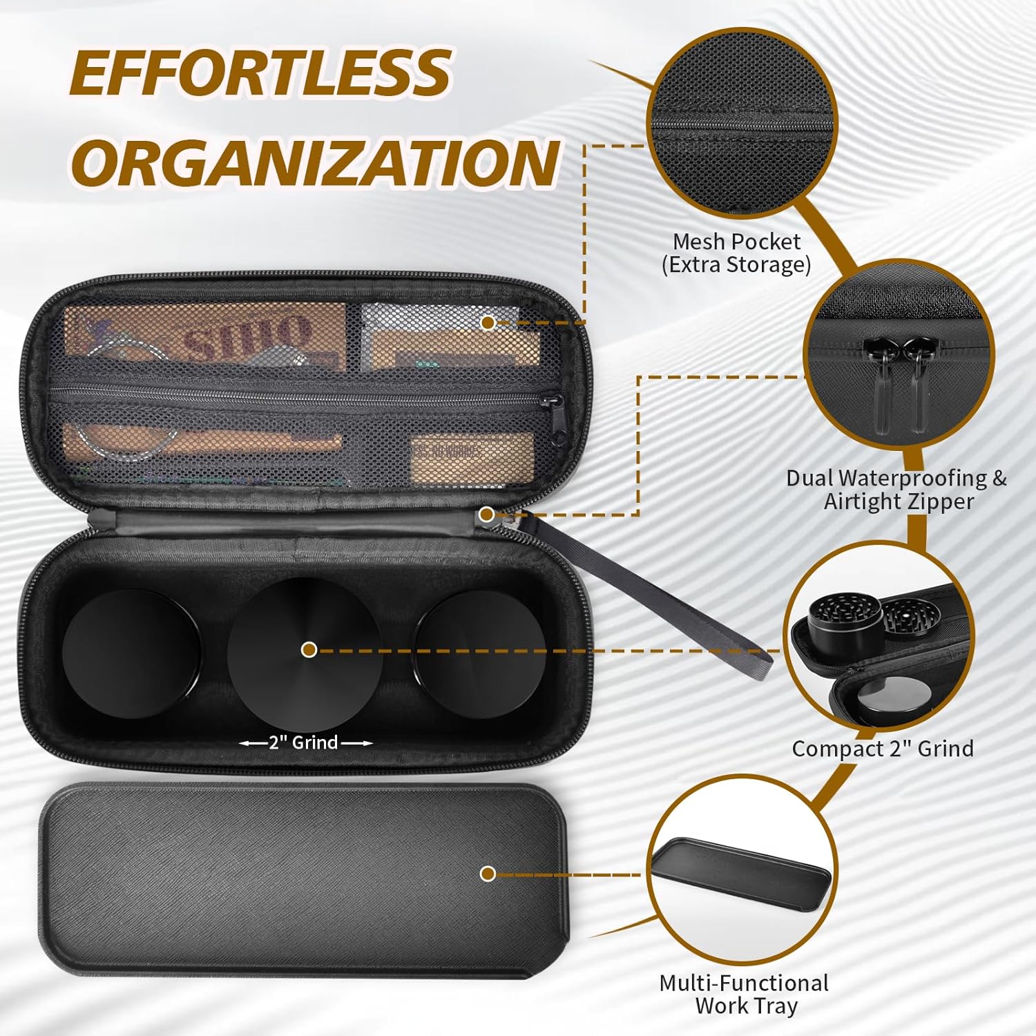 ใEssential & Practical AccessoriesใThis smell-proof bag includes two UV-sealed glass jars, a multi-functional work tray, a double mesh pouch, and a premium 2 inch grind. Every essential tool is thoughtfully integrated and within reach.
