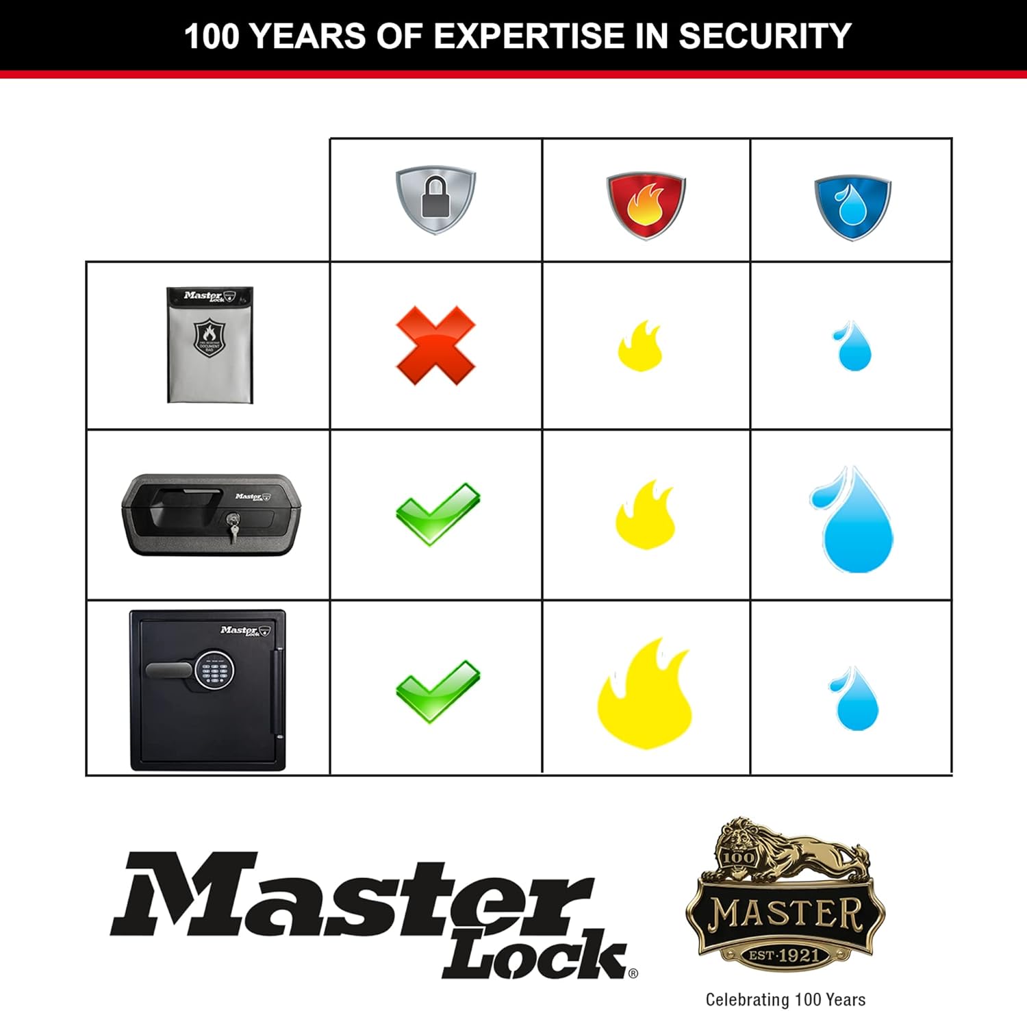 The Master Lock FBWLZ0EURHRO fireproof document bag is for keeping all your valuables in one place to save time in the event of a fire or emergency. Tested to endure brief fire exposure, the fireproof bag will keep interior temperatures safe for irreplaceable documents and small valuable items: money, bank notes, ID papers, passport, birth certificates, A4 documents, jewels and more. The Master Lock fireproof bag has 4 layers of protection and is silicone-coated to give you just enough resistance from flames and water. While no document bag will survive a significant structural fire, the Master Lock fire bag for documents is designed to be used in conjunction with a Master Lock fireproof safe that is UL classified for fire protection as part of a total fire protection system. In business for over 100 years, trust Master Lock to safeguard the important and irreplaceable items in your life.