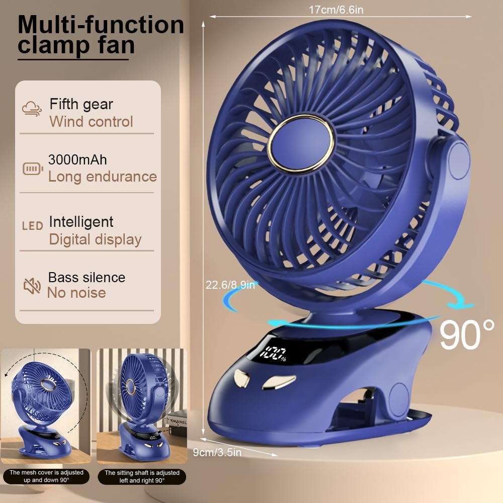 🍃Flexible Adjustment with LED Display:The clip on fan has a nimble head that can rotate 360 degrees both vertically and horizontally, allowing you to direct the airflow wherever you need it. It also features an LED display that shows the current wind speed and battery level when it is working.Additionally, the small fan’s battery level indicator does also serve as a reminder to charge it before this fan runs out of power.