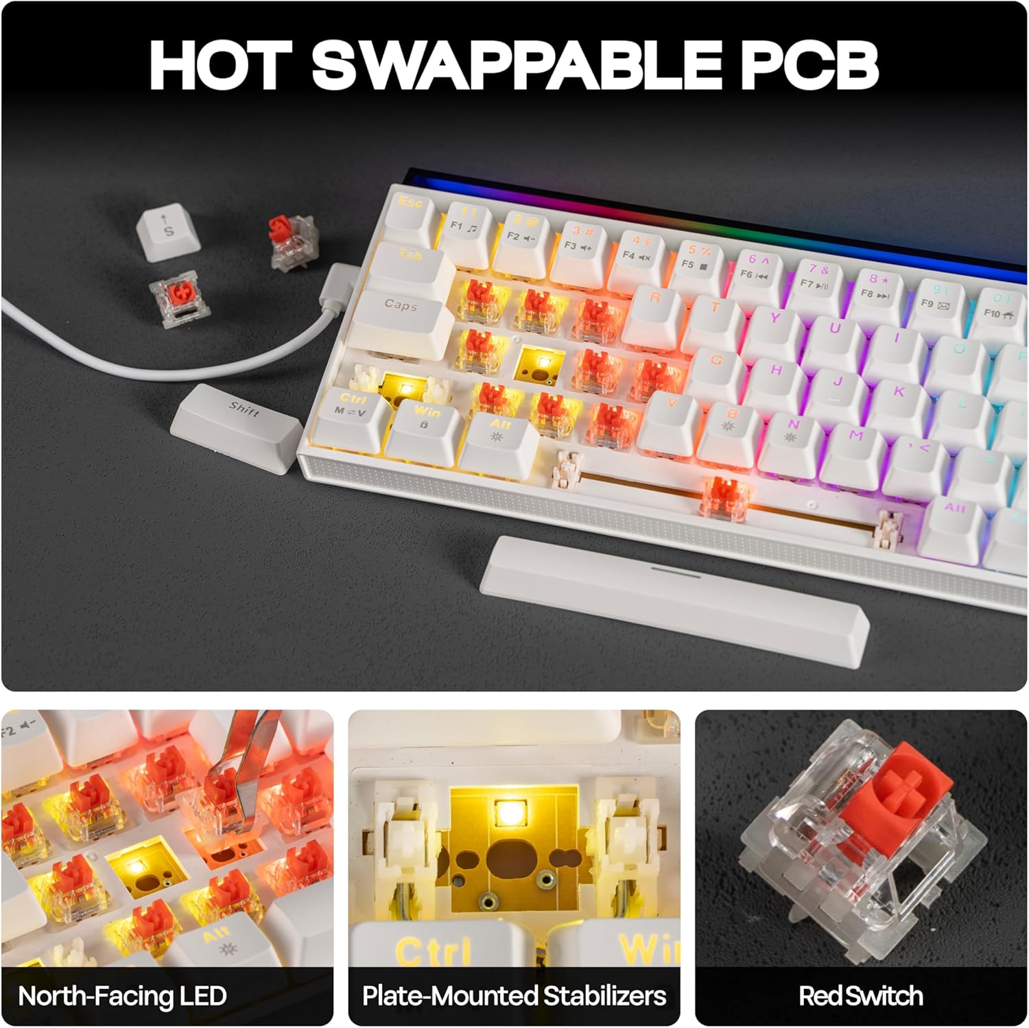 【Tray Structure & Hot Swappable】 Introducing the NK68 keyboard, designed with a unique tray-mounted structure that enhances stability and durability. Our innovative design effectively absorbs keystroke vibrations, elevating your typing experience and reducing fatigue. And hot swappable board allows users to easily replace individual switches without soldering. With simply a pull of the switch, users can experiment with various switch types—be it linear, tactile, or clicky—tailoring their typing experience to their liking.