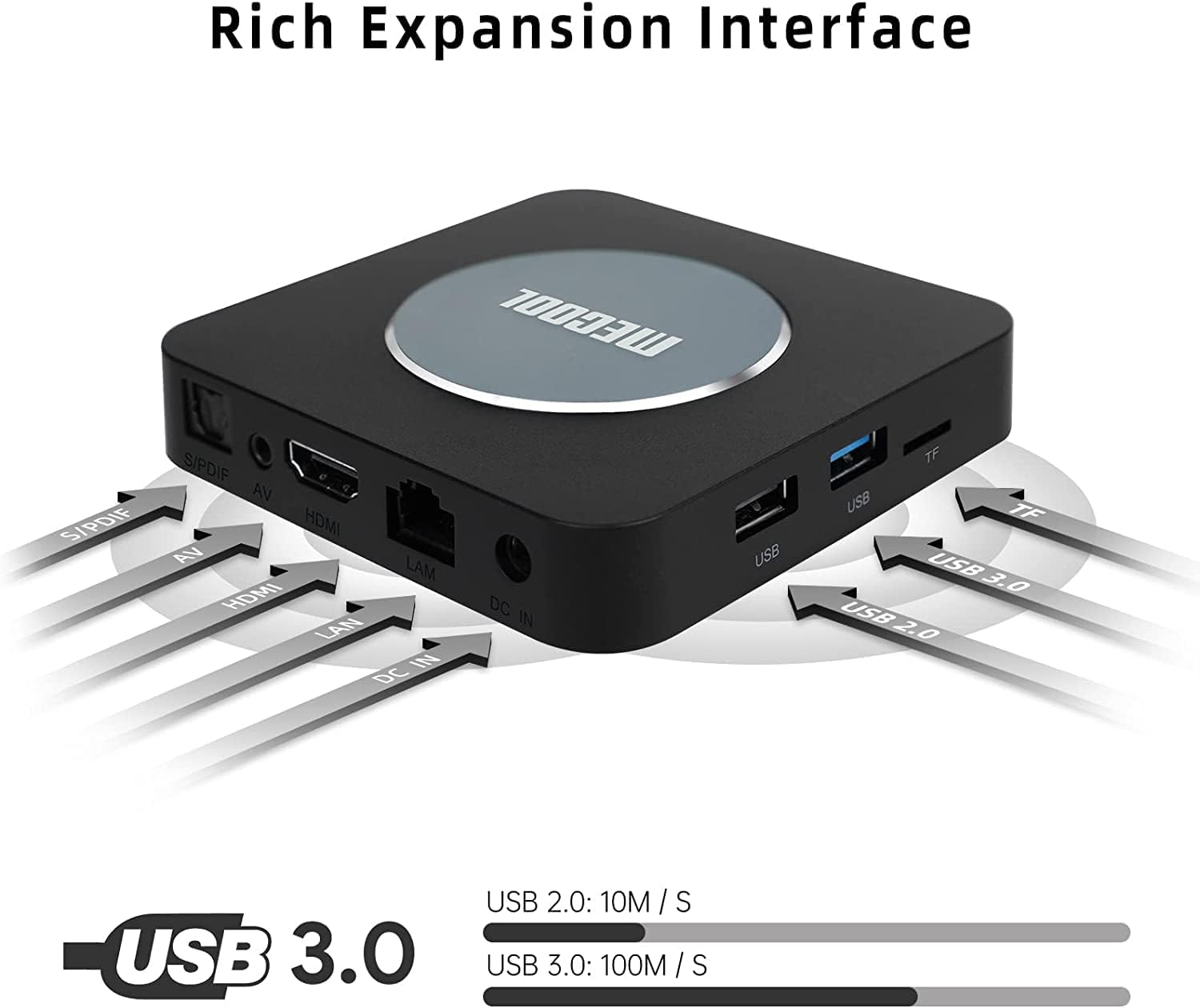 The MECOOL KM2 Plus with Android TV 11 is a breeze to Setup, and easy Internet connection via dual band Wi-Fi 5 2.4G 5G Dual WIFI with AC or the built-in LAN (10/100 fast Ethernet port also onboard). Connect Bluetooth devices such as speakers, sound bars, headphones, keyboards etc. The 2 USB ports allow you to connect 2 accessories at the same time