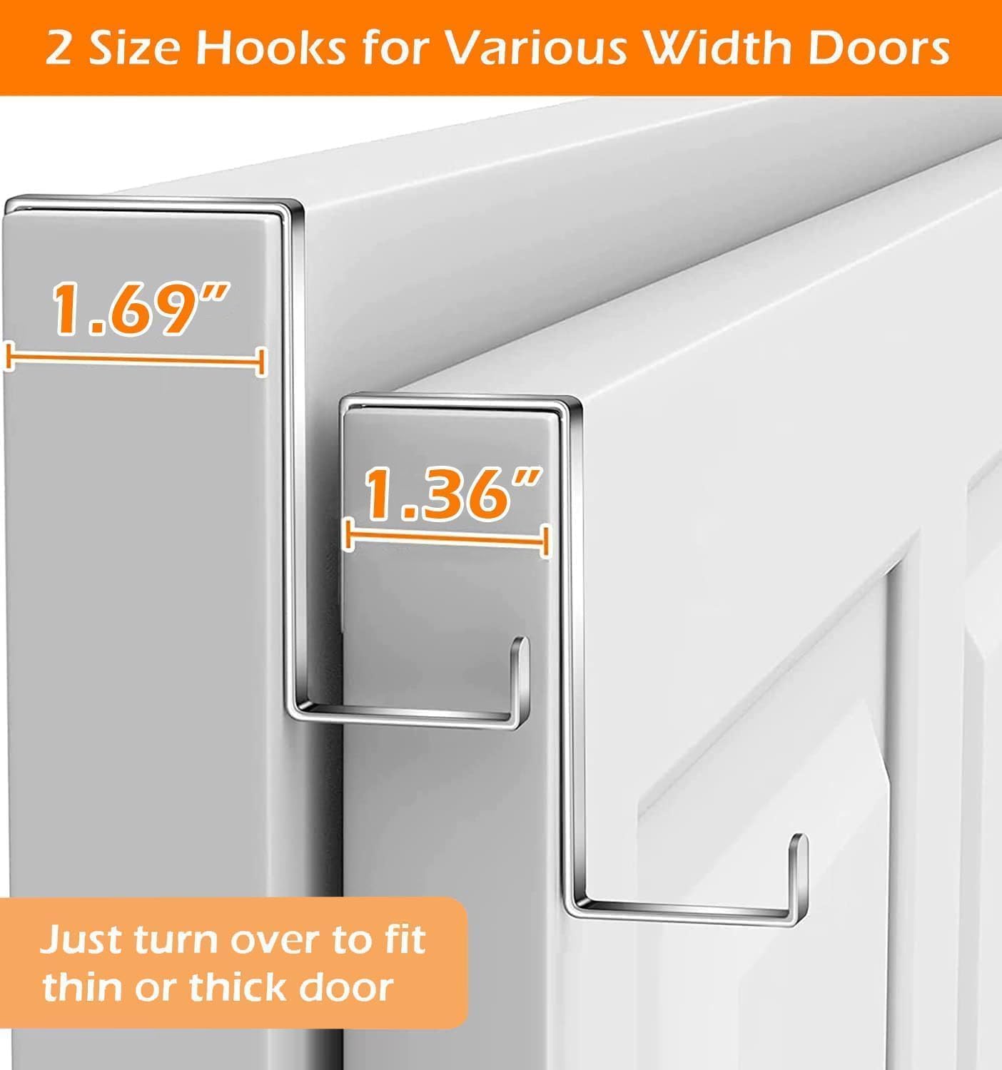 I got this storage organiser for shoes, to reduce clutter on the floor and free up cupboard space. I screwed it to the wall. It works well.The description’s “Two different wide 4 over the door hooks are inculded” means “Four identical over the door hooks with two different widths are included”. Too narrow for my 44 mm doors.