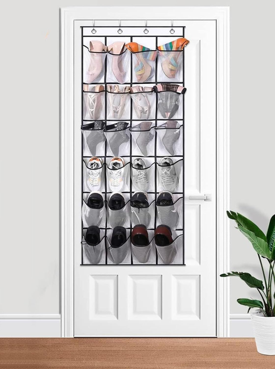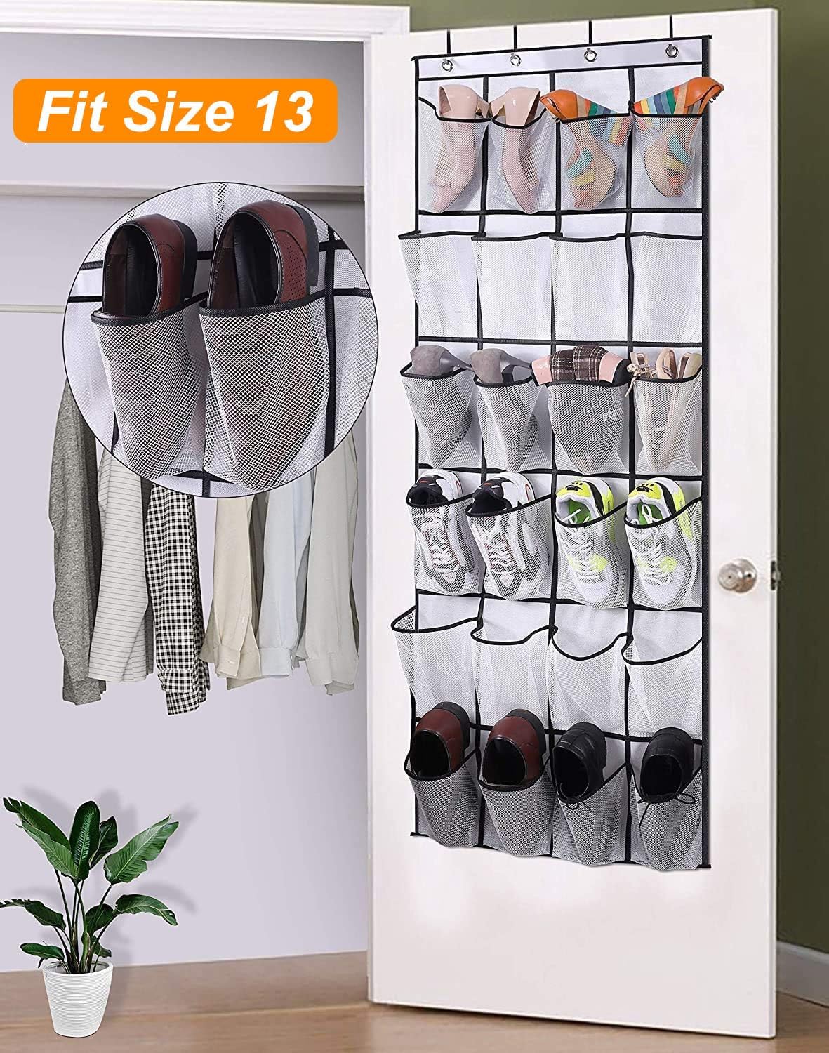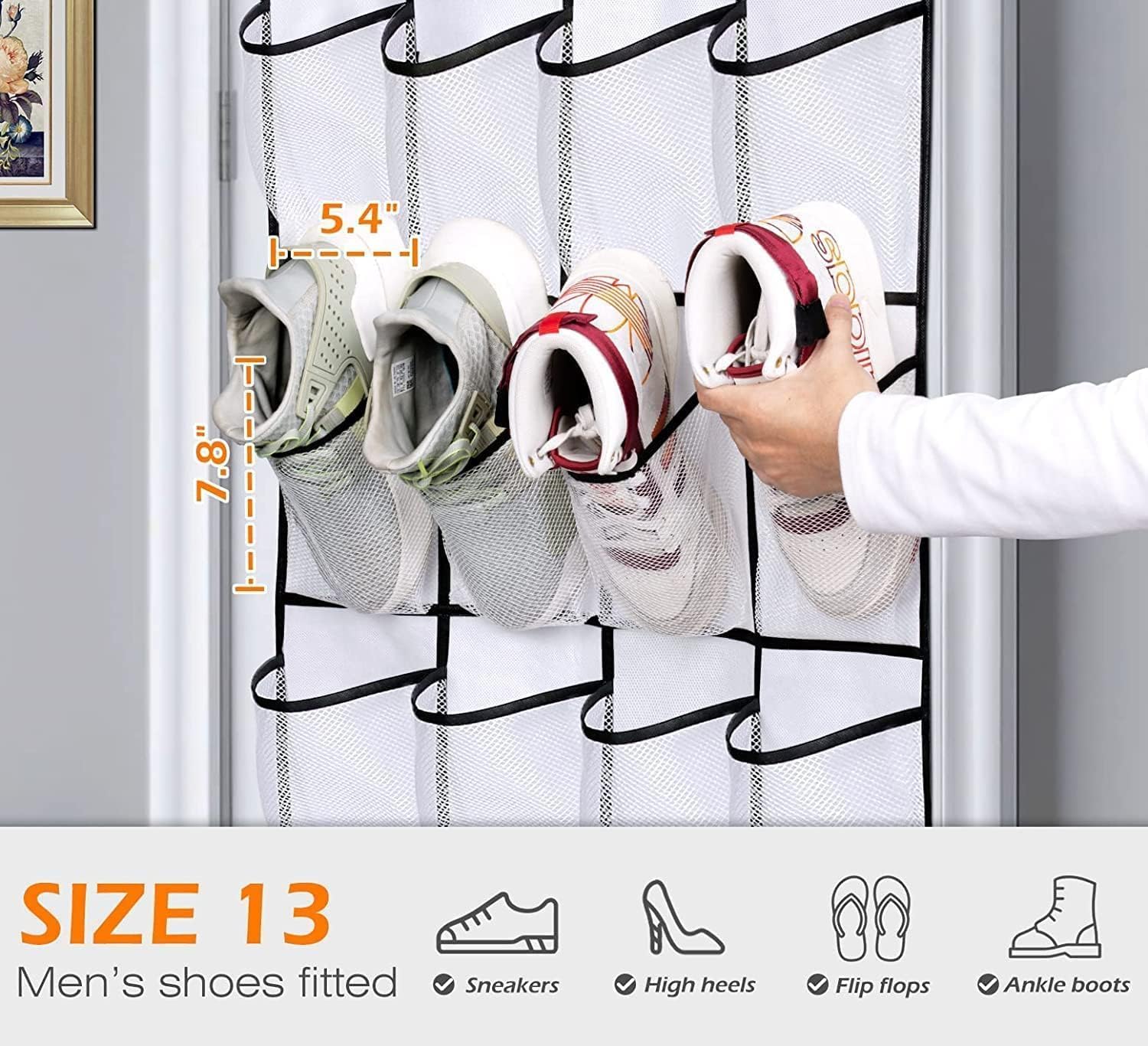 Back of door shoe holder shelf with 24 roomy clear see through mesh pockets organizer store up to 12 pairs of shoes