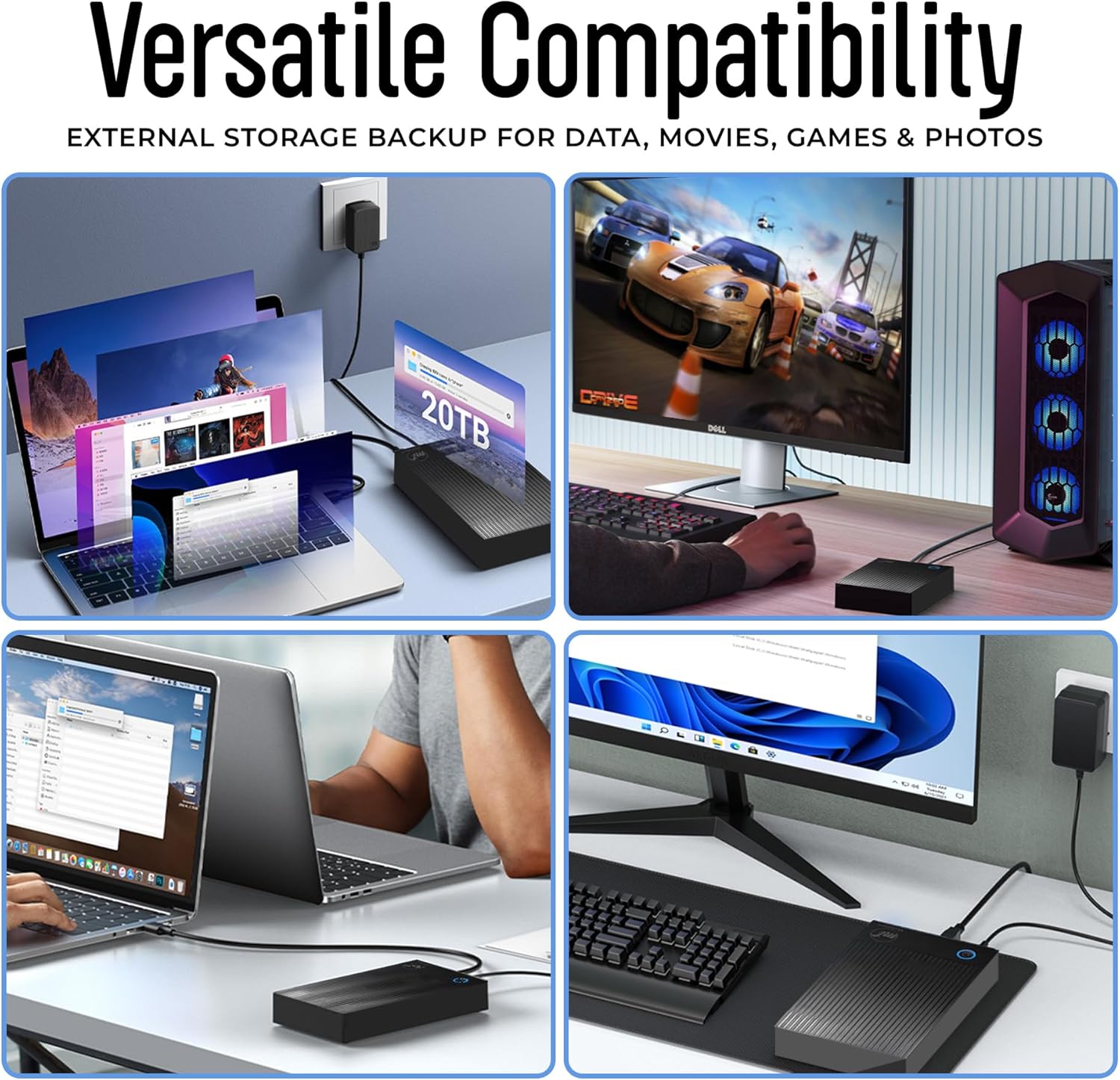 Wide compatibility across multiple devices: This external hard drive supports PCs, Macs, laptops, and gaming consoles, including PlayStation and Xbox. It is compatible with Windows, MacOS, and Linux operating systems, offering seamless plug-and-play functionality for a variety of uses without additional software or setup.