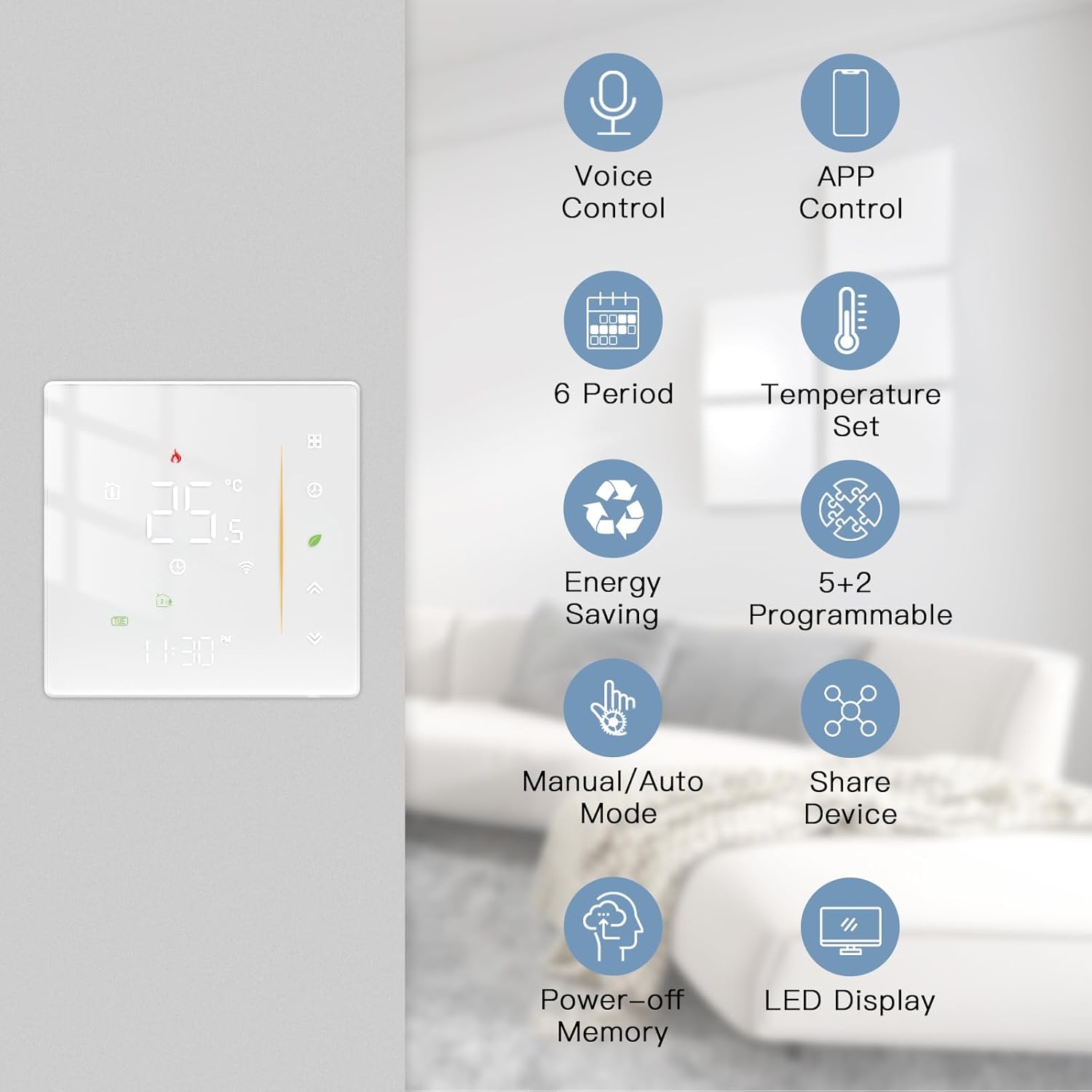 【User-friendly design】Connect with voice assistants such as Alexa or Google Home, control the thermostat heating with simple voice commands, free your hands; power failure protection, safely save all your settings; Screen lock to prevent accidental settings changes;【Attention】1.Netural Wire required 2.Wall thermostat for 16A electric underfloor heating.
