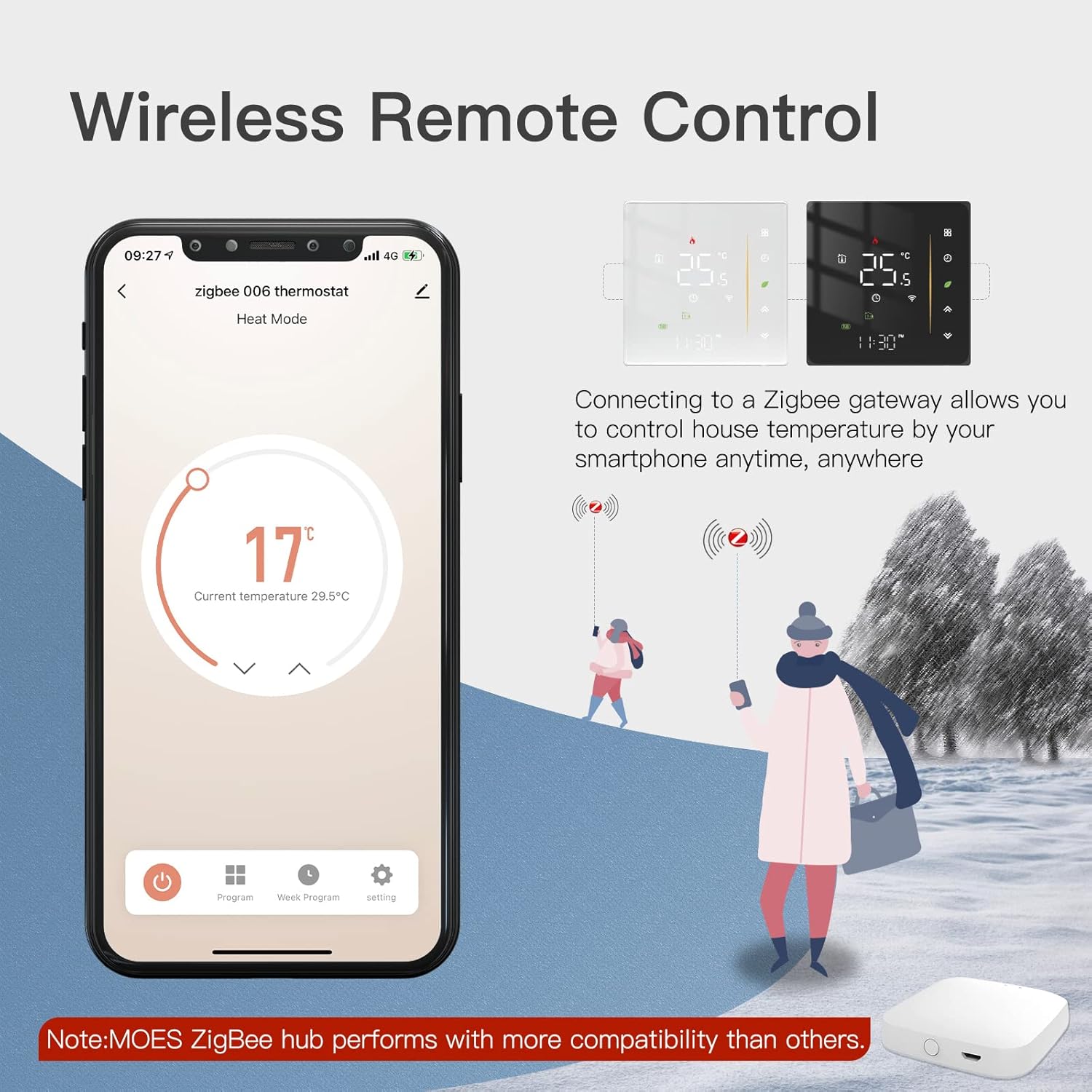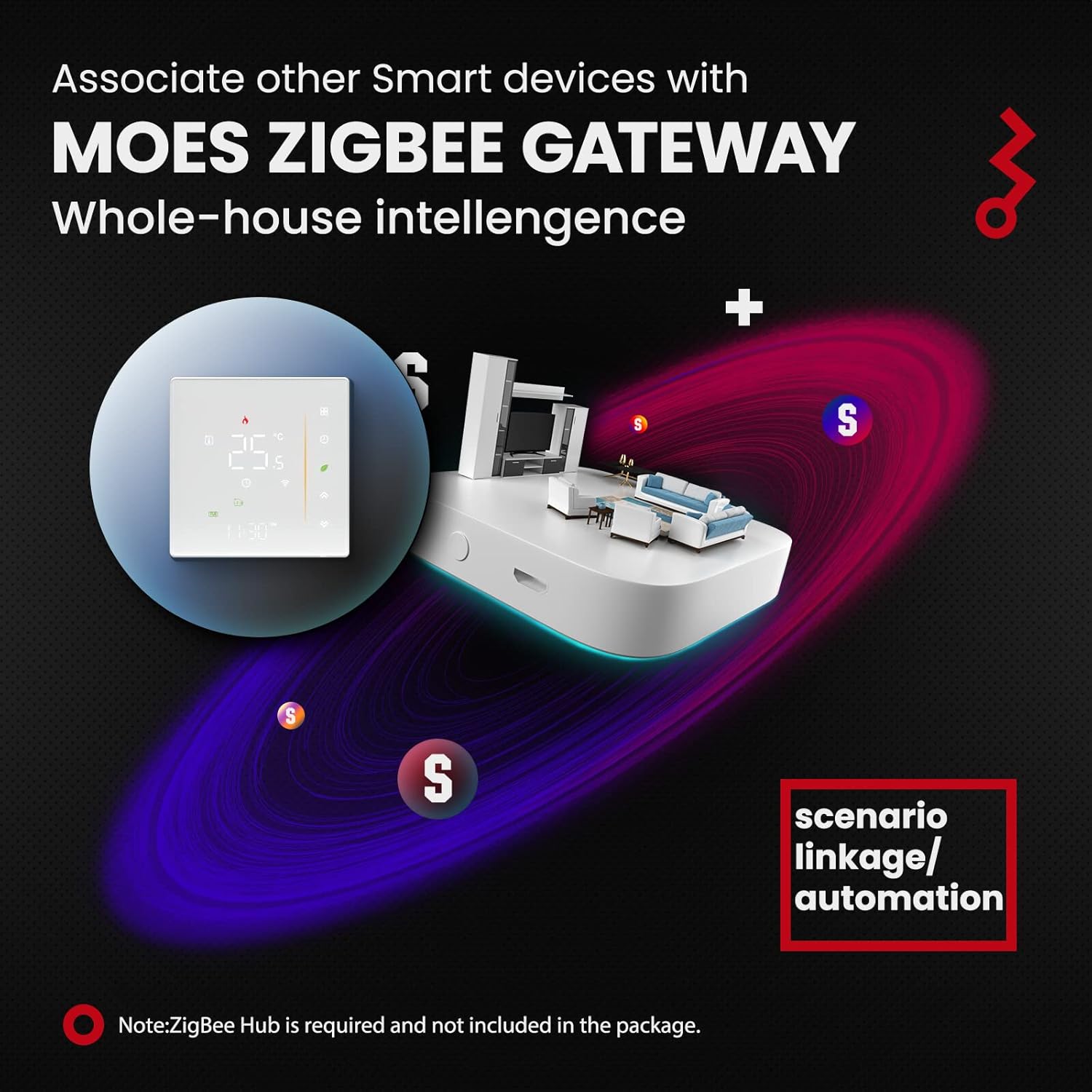 ?Intelligent Heating System?Thermostat with Tuya Zigbee protocol for electricity underfloor heating with constant temperature heating, providing the most intelligent temperature control for your room to give you a comfortable smart home experience. ?ZigBee Gateway/Hub Required?Need a MOES ZigBee Hub to connect the thermostat, which has proven to be a bridge and control center for smart homes and plays an irreplaceable role for all ZigBee products. Has proven to be a really good replacement for unstable WiFi networks. Simply add the thermostat to the ZigBee hub after adding the hub to the MOES/Smart Life/Tuya app. ?APP Remote Control?Control the home temperature via Tuya/Smart Life APP requires 2.4GHz WiFi connection & MOES Zigbee hub , change temperature settings on your smartphone anytime, anywhere, create schedules, turn room thermostat on and off, create smart scenes or share devices with family, implement multiplayer control.