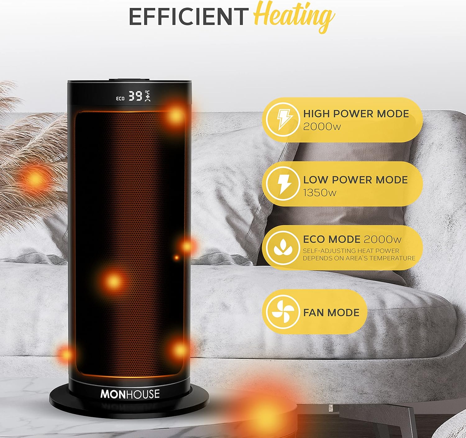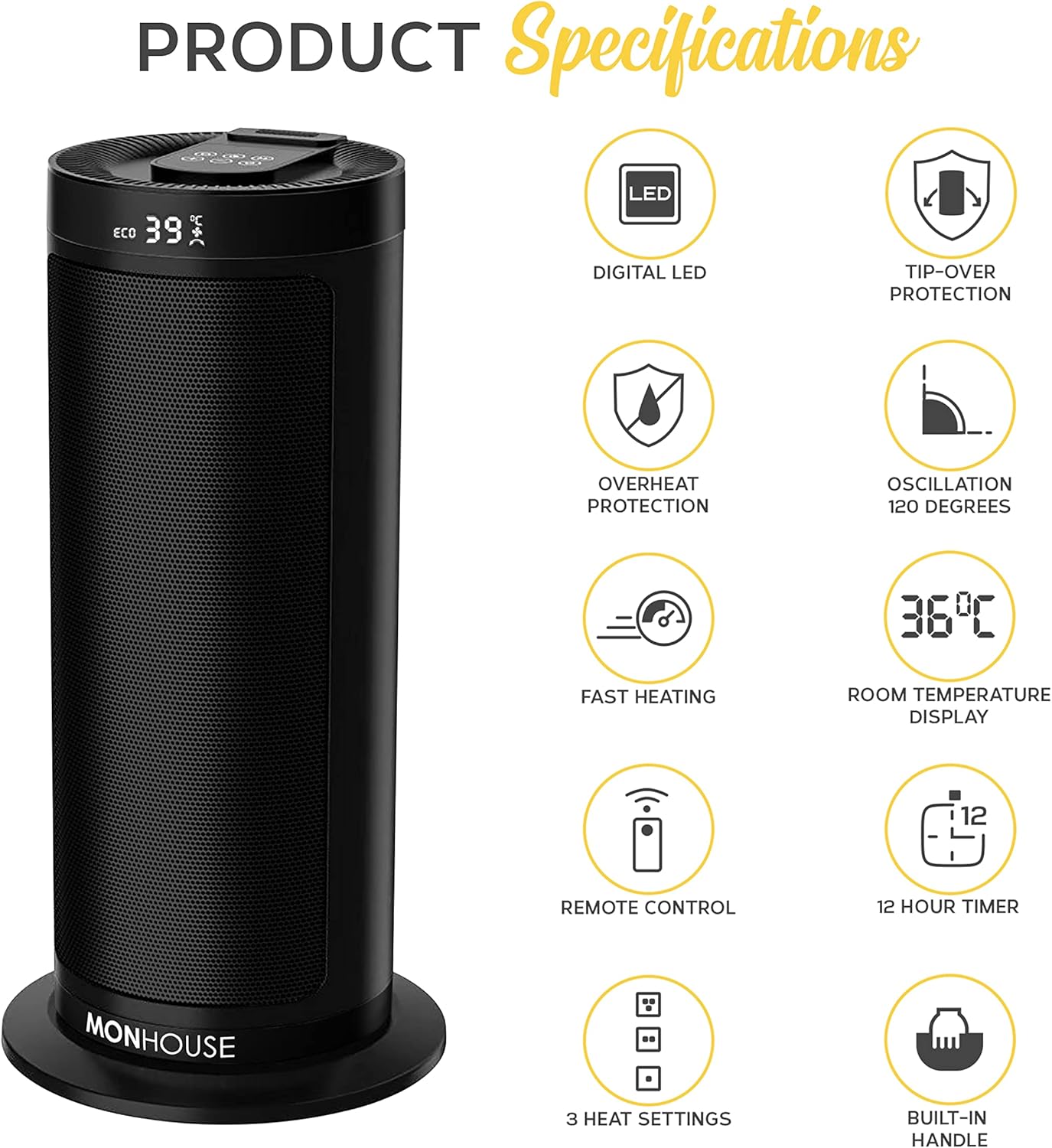MONHOUSE Electric Heater – Energy Efficient PTC Ceramic, Silent Portable Heater with LED Display, Remote Control, Overheat Protection, Smart Thermostat, 1-12HR Timer – Ideal for Office, Home, Bedroom