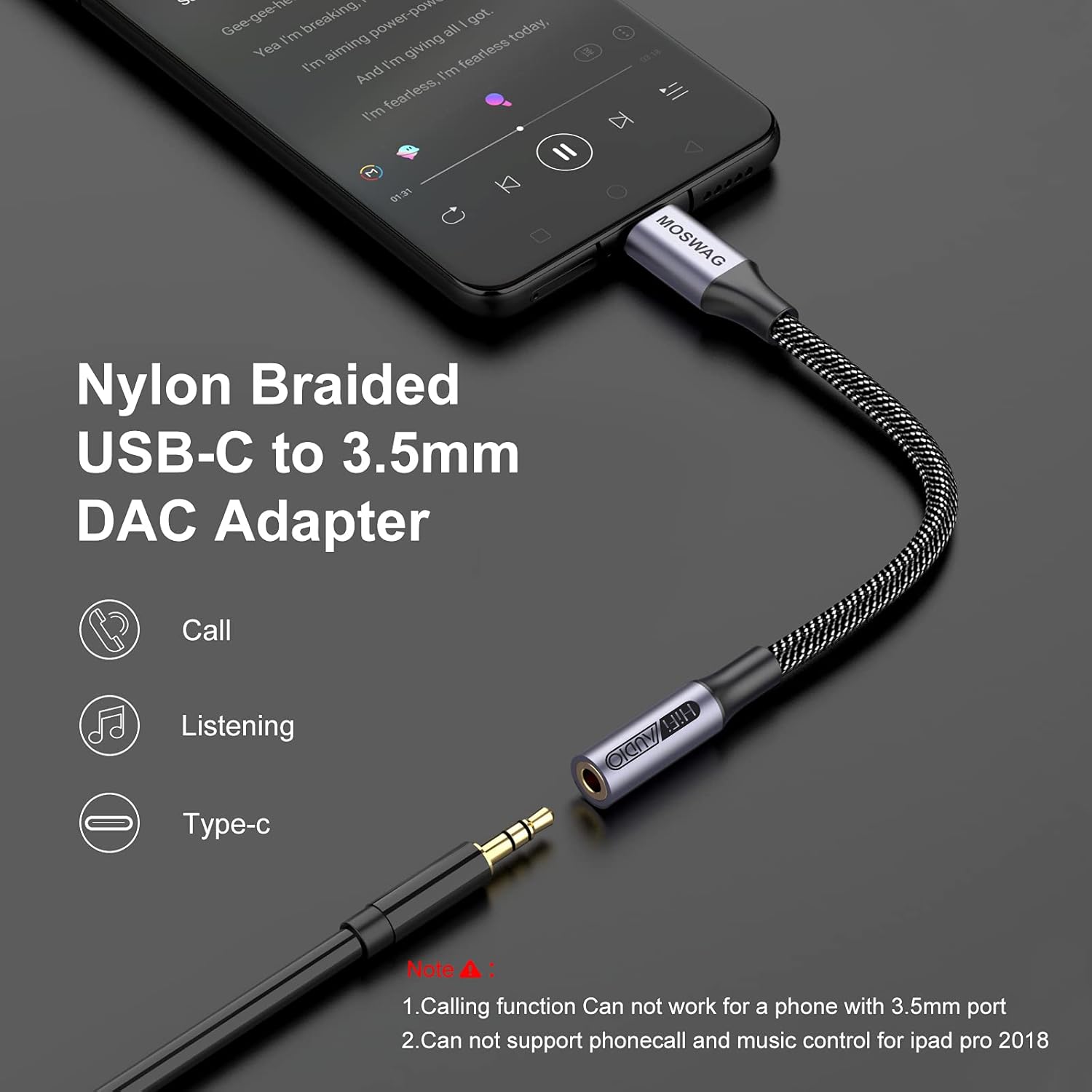【Plug and Play】: No software download needed with MOSWAG Audio Adapter; Small & lightweight, easy to carry around; Unblock the world of Hi-Fi audio for you anytime anywhere with this USB C to Aux Dongle Cable..