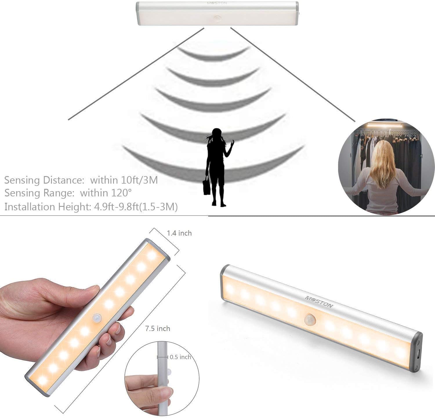Motion Sensor Closet Lights, MOSTON 10 LED Wireless Under Cabinet Lighting with Built-in Rechargeable Battery, Stick-on Anywhere Magnetic Night Lamp for Cupboard Cabinet Kitchen Wardrobe, Warm White
