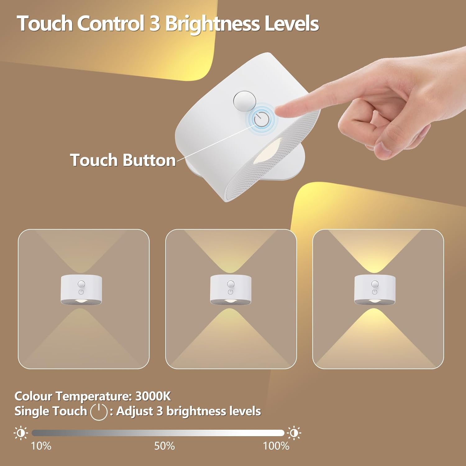 Motion Sensor LED Wall Light, Rechargeable Battery, 3 Brightness Levels, Touch Control, 360° Rotating Indoor Wall Lamp, Wireless Lights for Living Room, Bedroom, Hallways, Stair, Galleries