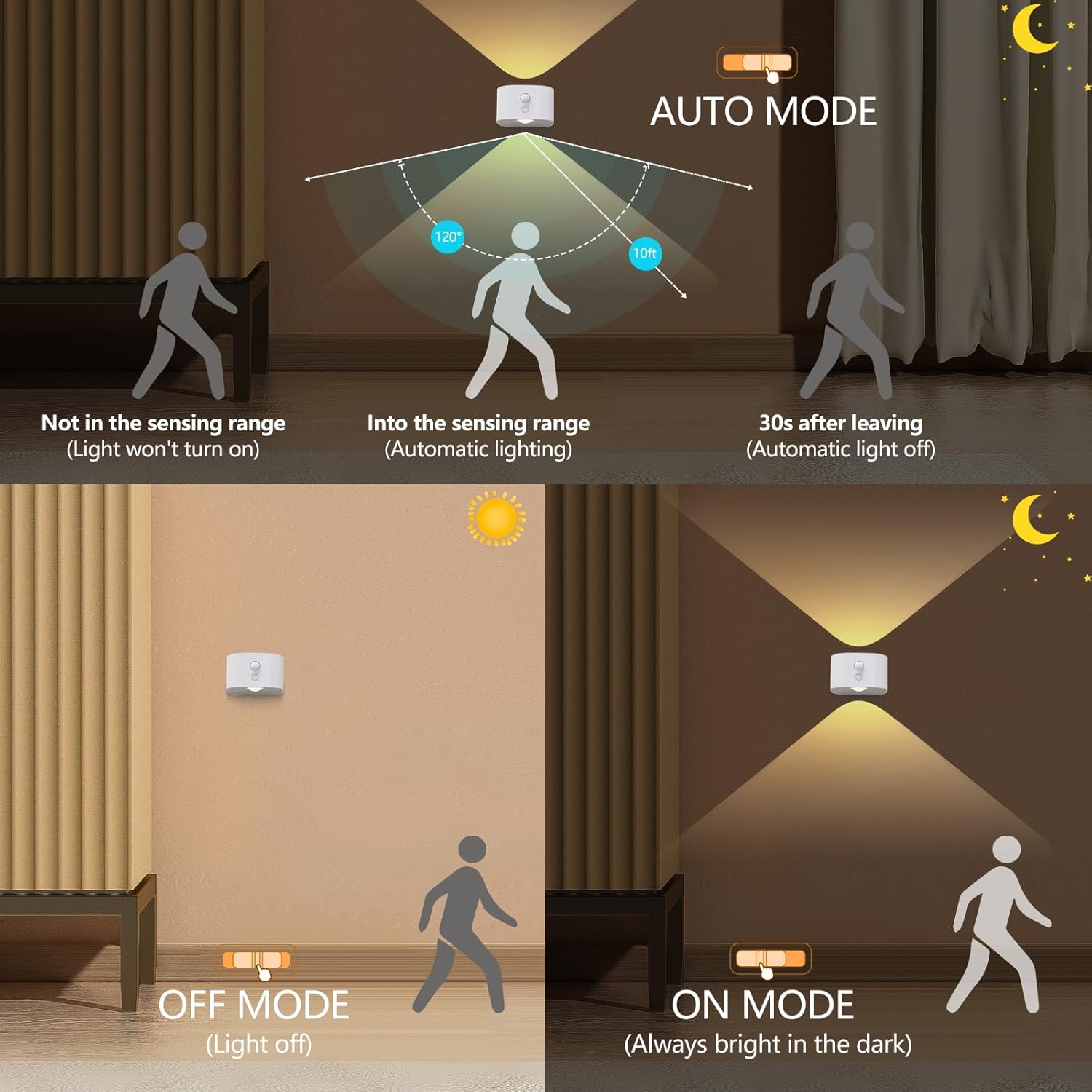 【Motion Sensing Technology】The wall lamp is equipped with a motion sensing device. In AUTO mode, when the ambient brightness is less than 20LUX,The person is within 120°and 3M of the light will automatically turn on and last for 30 seconds. The light and motion sensor offers you convenience and energy saving.Wireless wall lights up when you need it most