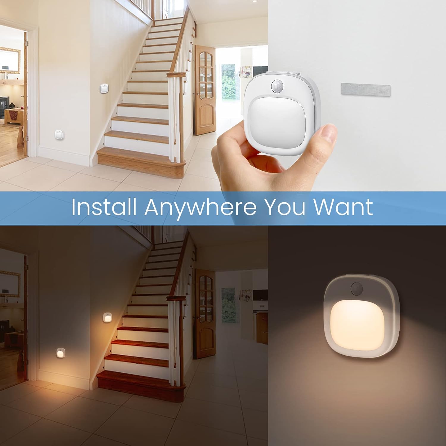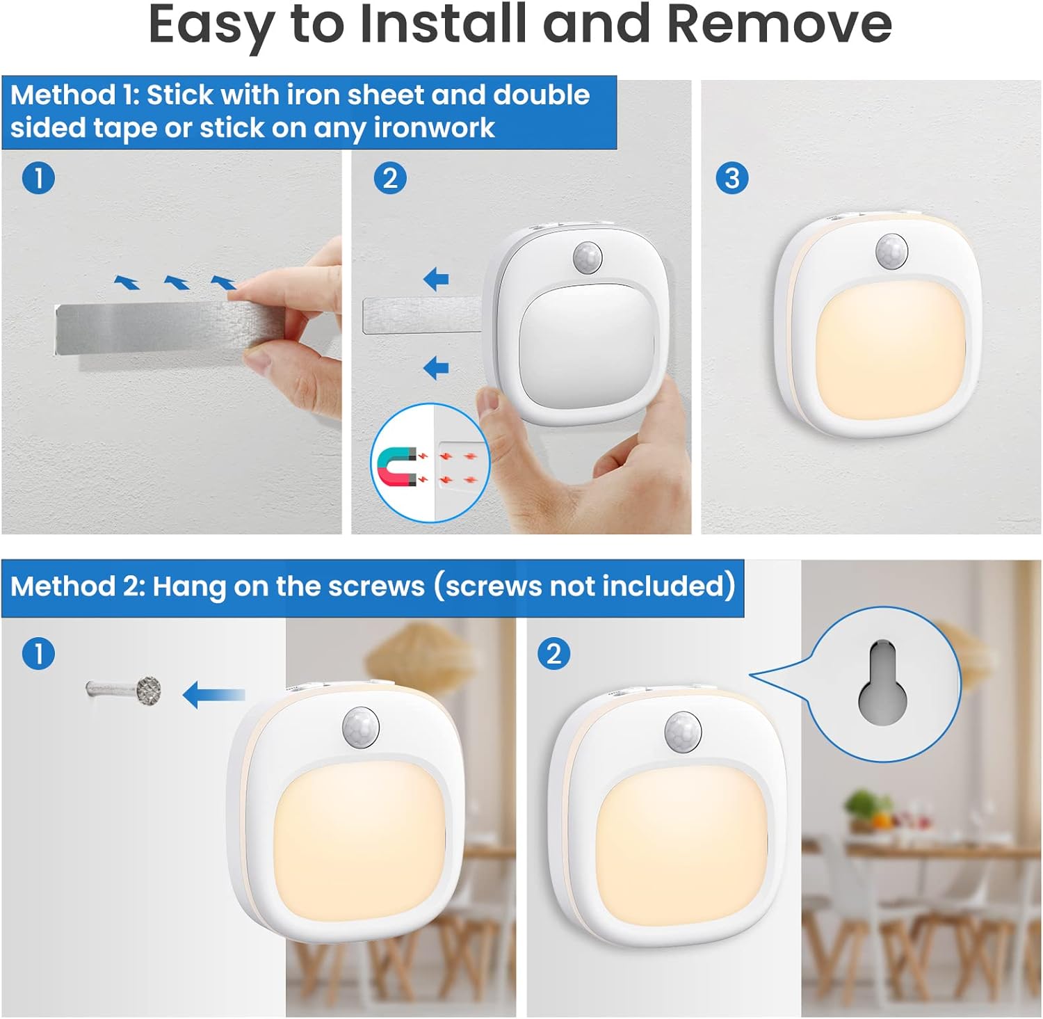 ☀Easy Installation: With the included magnet strip and 3M adhesive tape, this motion sensor light could be stuck to a desired place. Or drive a screw into the wall and align it with the suspension hole of the stick-on lights.