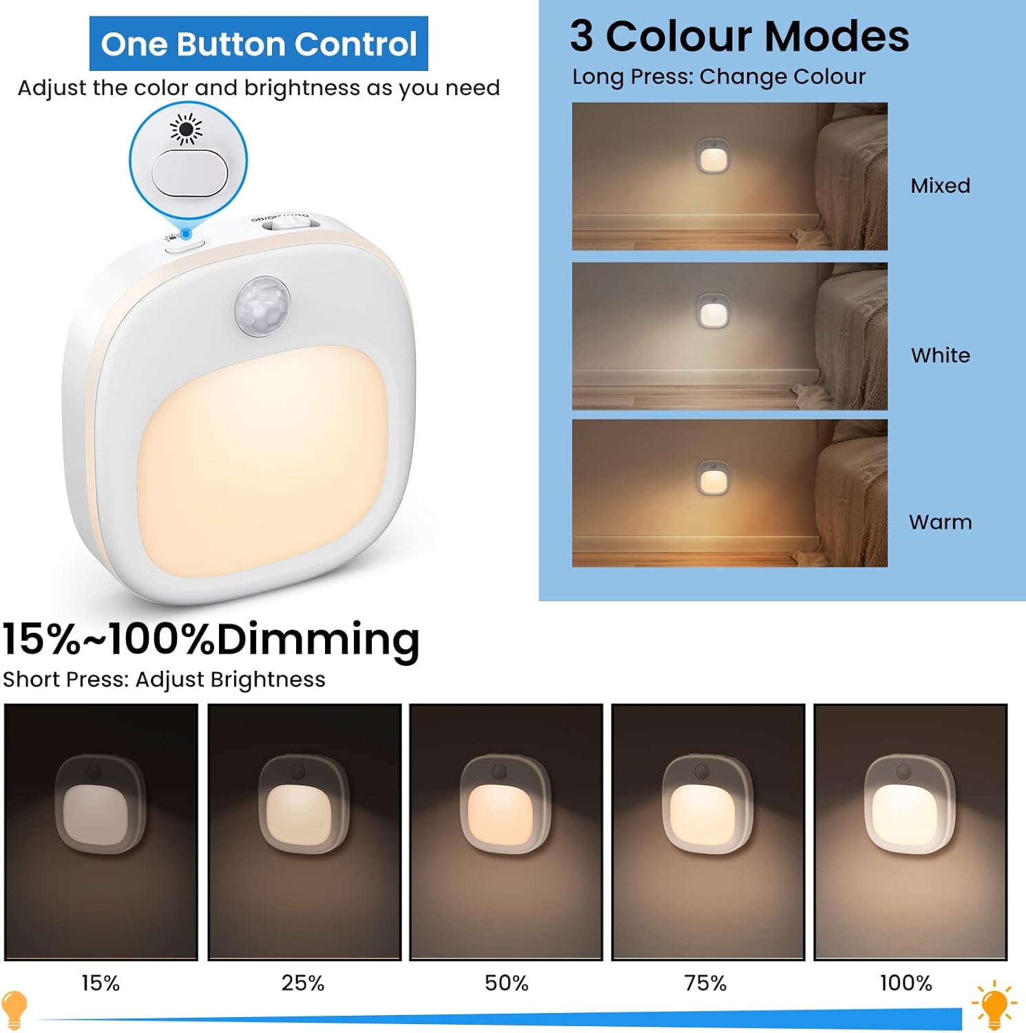 ☀Eay to Use: The lighting modes of this night light are all controlled by buttons. Long press the dimmer button to select from 3 colours. Short press the dimmer button to select the nightlight glow ( 15%, 25%, 50%, 75%, 100%). Memory function ensures the sensor light performs the same colour setting as last time.