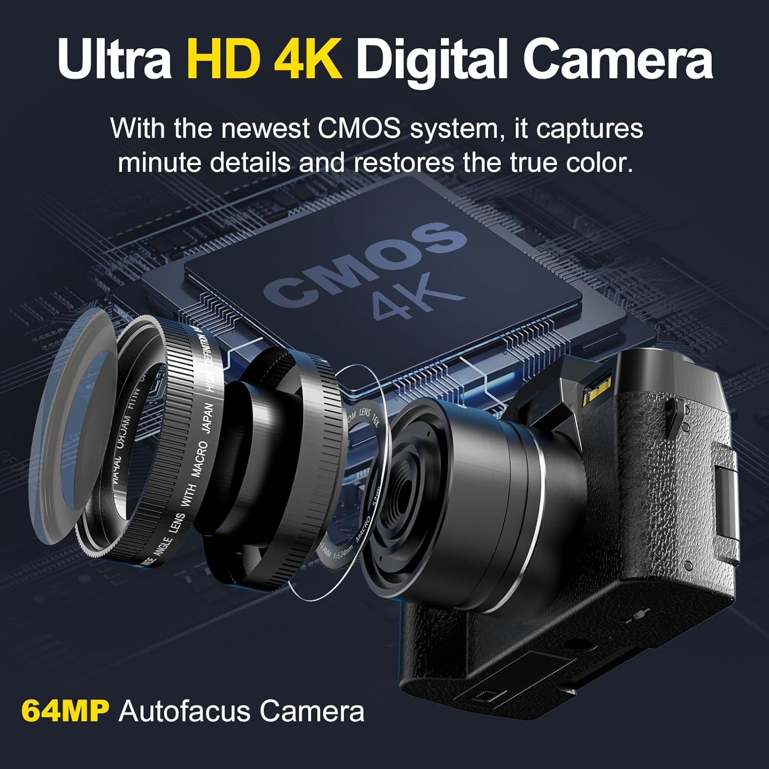 📷 [Digital camera for Photography and Video] : This digital camera features amazing 4K video capabilities and a high resolution 48MP photo mode, allowing you to capture incredible moments in extraordinary clarity. The video camera has a 3-inch touchscreen that rotates 180 degrees, making blogging a breeze. Frame your photos or view your records as you blog from any Angle.
