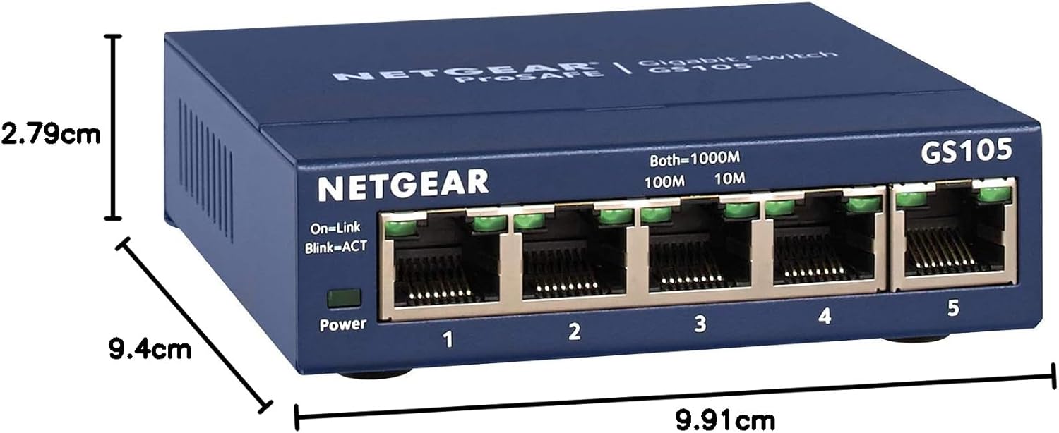 NETGEAR GS105UK 5-PORT GIGABIT UNMANAGED ETHERNET SWITCH. (NOTE:- Please be aware that multiple different types/models of these Netgear switches are all foolishly grouped together under one single product review. Unless the review CLEARLY states the SPECIFIC model, you could be reading a review for a completely different model to the one you’re looking to purchase)!!!ADDITIONALLY – Before I mention anything else, IF you do purchase the “GS105UK Unmanaged” – You MAY NEED to connect your router to PORT 5. (There’s been conflicting info online regarding this issue for YEARS. Worse still, there’s multiple versions of the GS105 as it’s been in continuous production for years, in different variations, & released in countless nations. Some versions/variants ARE different to others!! (My last Netgear GS105 also inexplicably required the router in port 5 for example). Netgear’s aging installation diagram shows the modem/router connected to a centre port. Many sources say it just doesn’t matter which port, whilst others say the router must be connected to port 5!! (However, IF I don’t use port 5 for my router on my switch & I connect another device there instead, it drops all other connections. Router in port 5, everything works exactly as it should regardless of connecting/disconnecting any other ports). With that out of the way….As with many, I have an ever increasing number of devices in my home with internet connectivity that include ethernet. Router manufacturers insist on limiting available ethernet ports to 4 or in some cases only 2 & it’s just not enough. If you just need additional ethernet ports without any other hassle, an unmanaged switch is an ideal solution. I’ve been networking PC’s since the latter 1990’s at a home/semi-enthusiast level or setting up for others. I’ve always prefered my static devices such as desktops, gaming consoles, TV, miscellaneous devices, (frequently laptops as well) to be hard wired for security, speed, & reliability, especially with some of my devices constantly file sharing, streaming, etc. My previous unmanaged switch recently died after many years solid service. I settled on another unmanaged switch for my current needs & for most who simply need extra ethernet ports, an unmanaged switch is all that’s required. Given the low cost of these devices now, if I find a managed switch would be more beneficial I’ll purchase one as required. I’m reasonably tech savvy, since installing the switch I’ve used a number of the most common tools freely & readily available for testing my home network for any issues. Thus far this new Netgear switch has performed admirably & I haven’t run into any problems at all, (other than the port 5 nonsense). I’ve recently purchased a new router & swapped out all of my old ethernet cabling as well. I’m very happy with the performance of the switch & the entire network.The switch is very well made & they now have a full metal enclosure, (my last one was plastic). They are easily wall mountable for keeping the switch & all the additional cabling as tidy as is possible. The ports are all solid & to date I’ve only had one older Cat6 cable where the connector failed to lock in place. All of my newer Cat6a cables lock in securely, (which is just as well as it’s considerably thicker than the 14 year old Cat6 it’s replacing & the Cat6a is not particularly pliable). Otherwise, it’s incredibly simple to use. Power up, connect your ethernet devices & that’s it, no software or configuration necessary. (If you require greater control/options, purchase a managed switch)!! Each port simply has a pair of green lights to visually confirm the status of individual ports.The product is supplied in retail packaging with a quick start guide, (if memory serves the quick start guide hasn’t changed in years). A power supply is also included, & a couple of small screws & raw plugs for wall/surface mounting. It’s a good idea to register your switch on Netgear’s website for warranty purposes, etc. Compared to a managed switch they are very simple but highly effective, they do their job perfectly well. I would happily recommend the GS105UK & gladly rate this updated metal variant at 5/5.