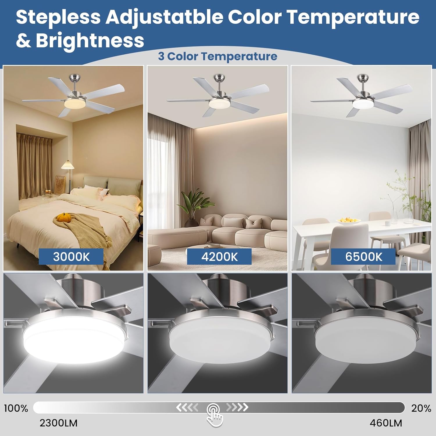 【Energy Class E】- The nordic ceiling fan with light upgraded to Energy Class E, more energy efficiency than most ceiling fan with light in the market. 3 color temperature smooth dimming from 3000k (warm white), 4000k(natural light) to 6500K(cool white). 24W LED stepless dimmable from 20%-100% brightness (460-2300LM) .