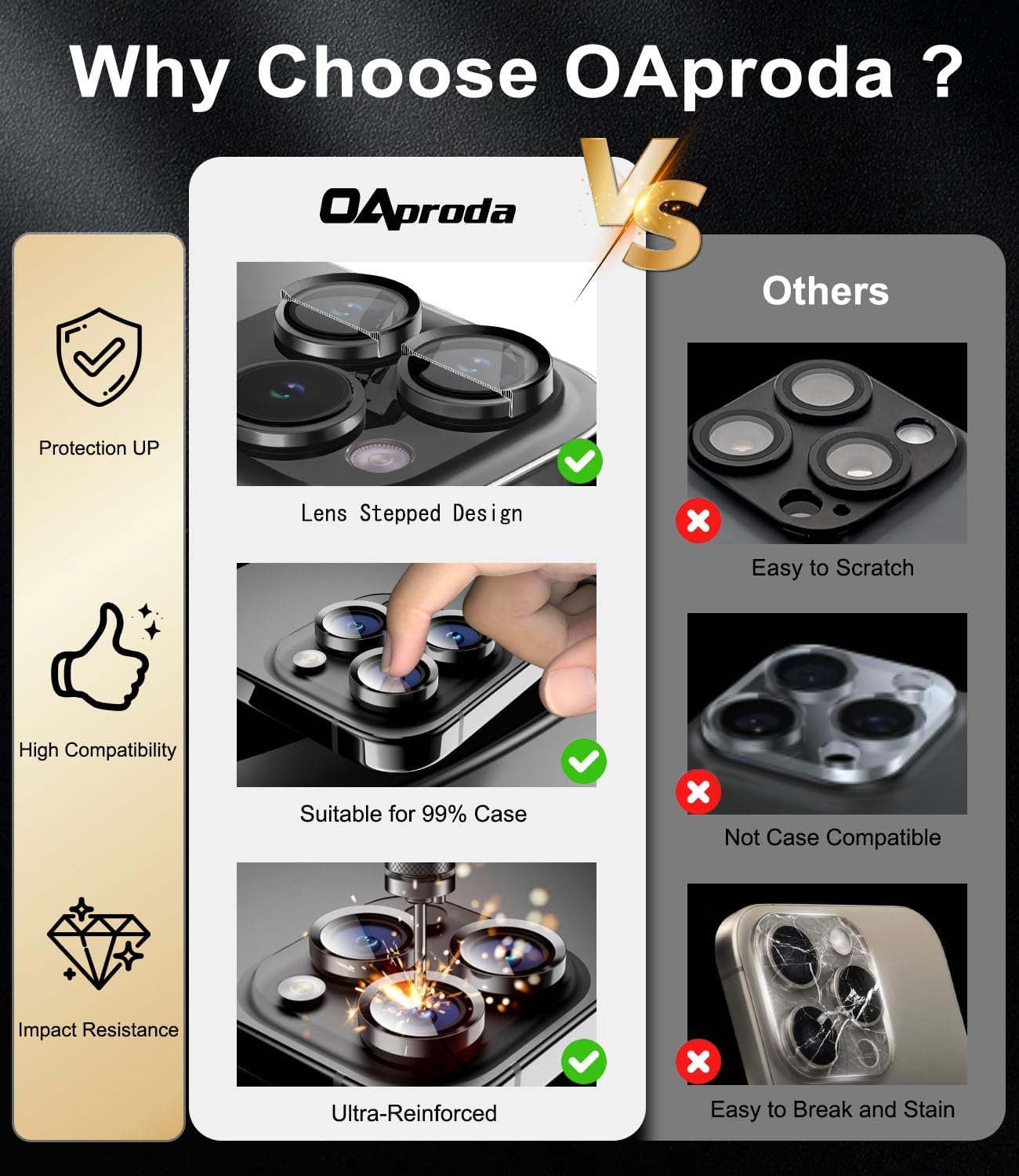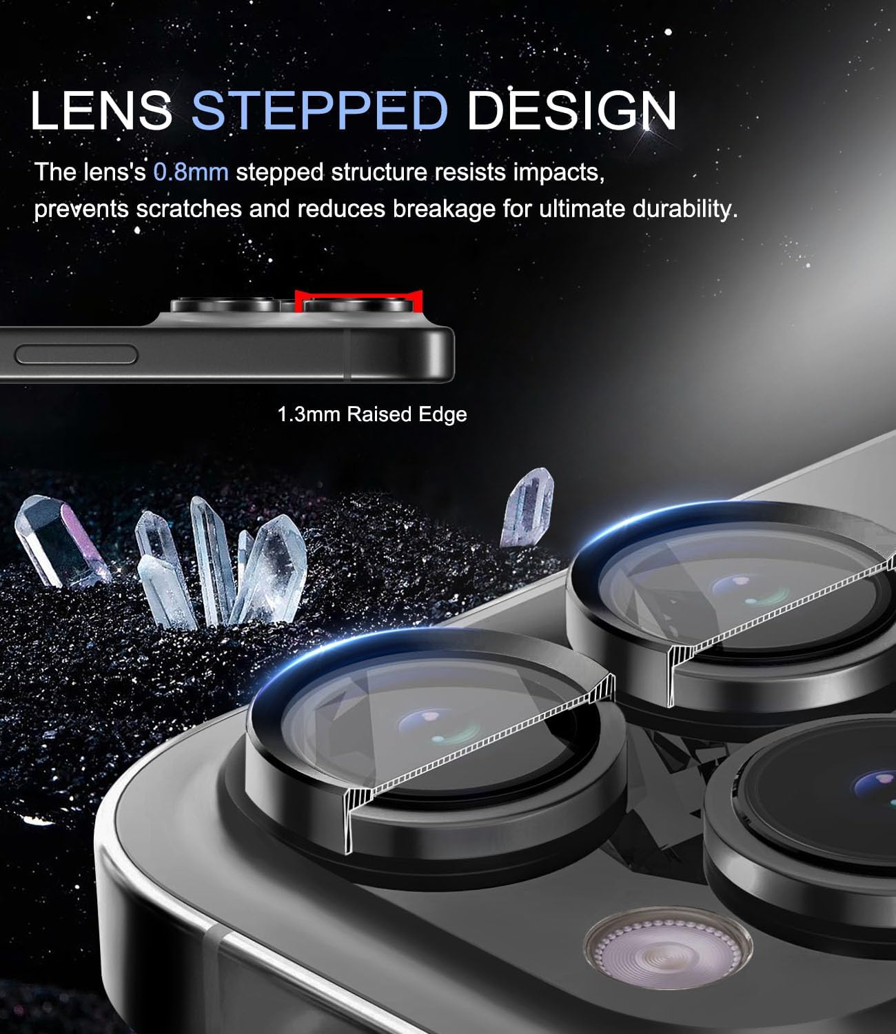 【Lens Stepped Design】The OAproda individual camera protector for iPhone 14 Pro Max, featuring a lens stepped design that holds its own patent, with glass edges incremented by 0.05 inches (1.3 mm), offers embedded protection and prevents direct contact with surfaces, providing your device with better professional safety and effectively saving you from costly repairs