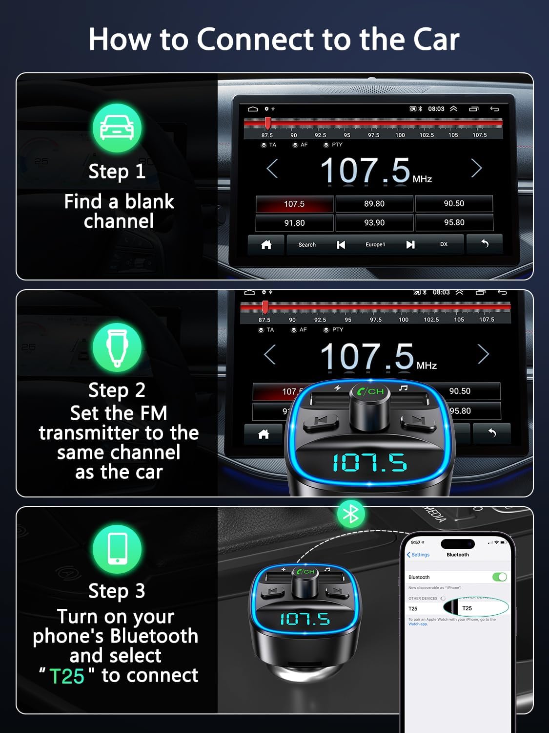13 reviews for ORIA Bluetooth 5.3 FM Transmitter for Car, Bluetooth Car Music Wireless Radio Adapter, Universal Car Charger with Dual USB Charging, Support TF Card & USB Disk (USB-C Converter Included)