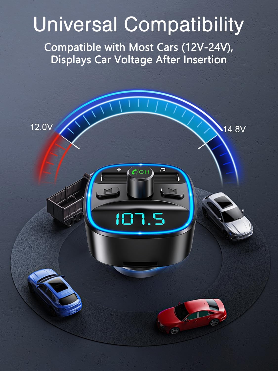 【𝐔𝐬𝐞𝐫-𝐅𝐫𝐢𝐞𝐧𝐝𝐥𝐲 𝐃𝐞𝐬𝐢𝐠𝐧】-When the Bluetooth radio adapter for car is plugged into the cigarette lighter, it displays the car voltage, allowing you to monitor the car’s health status at any time. Equipped with blue LED backlit, it helps you clearly see the buttons even in darkness, ensuring safe driving at night. Compatible with a wide range of devices that support Bluetooth, as well as vehicles operating on 12-24 V power supply