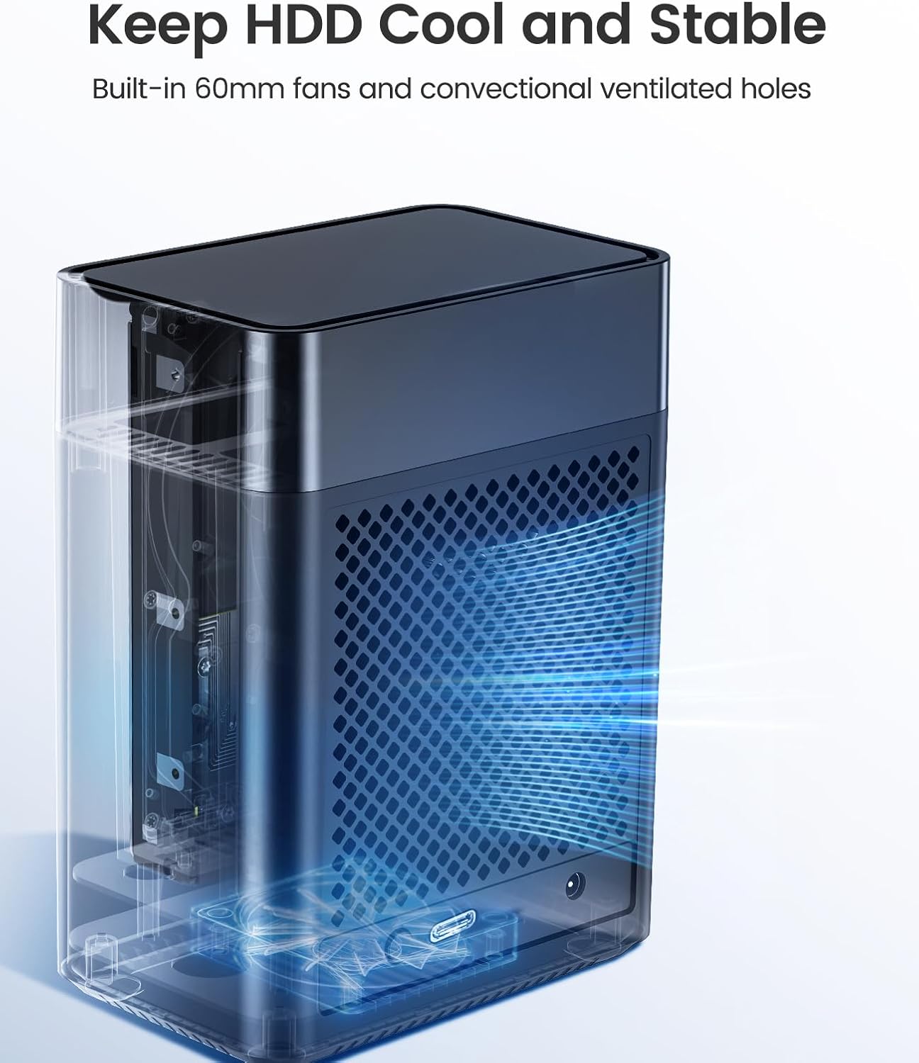 Heat dissipation is crucial for maintaining drive health and longevity. The ORICO enclosure features a built-in 120mm double ball bearing fan and large-area honeycomb holes for effective heat dissipation, keeping your drives cool even during heavy usage.