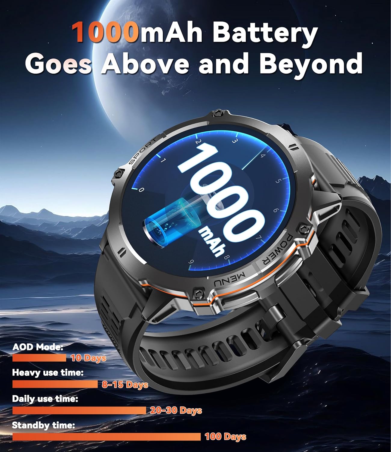 [1000mAh Large Battery] Oukitel BT13 smart watch has a 1000mAh battery (military grade) and always-on display mode. Combined with the latest super power-saving AI algorithm, this sports watch has excellent battery life: up to 10 days in always-on display mode, up to 30 days in daily use, and up to 100 days in power saving mode.