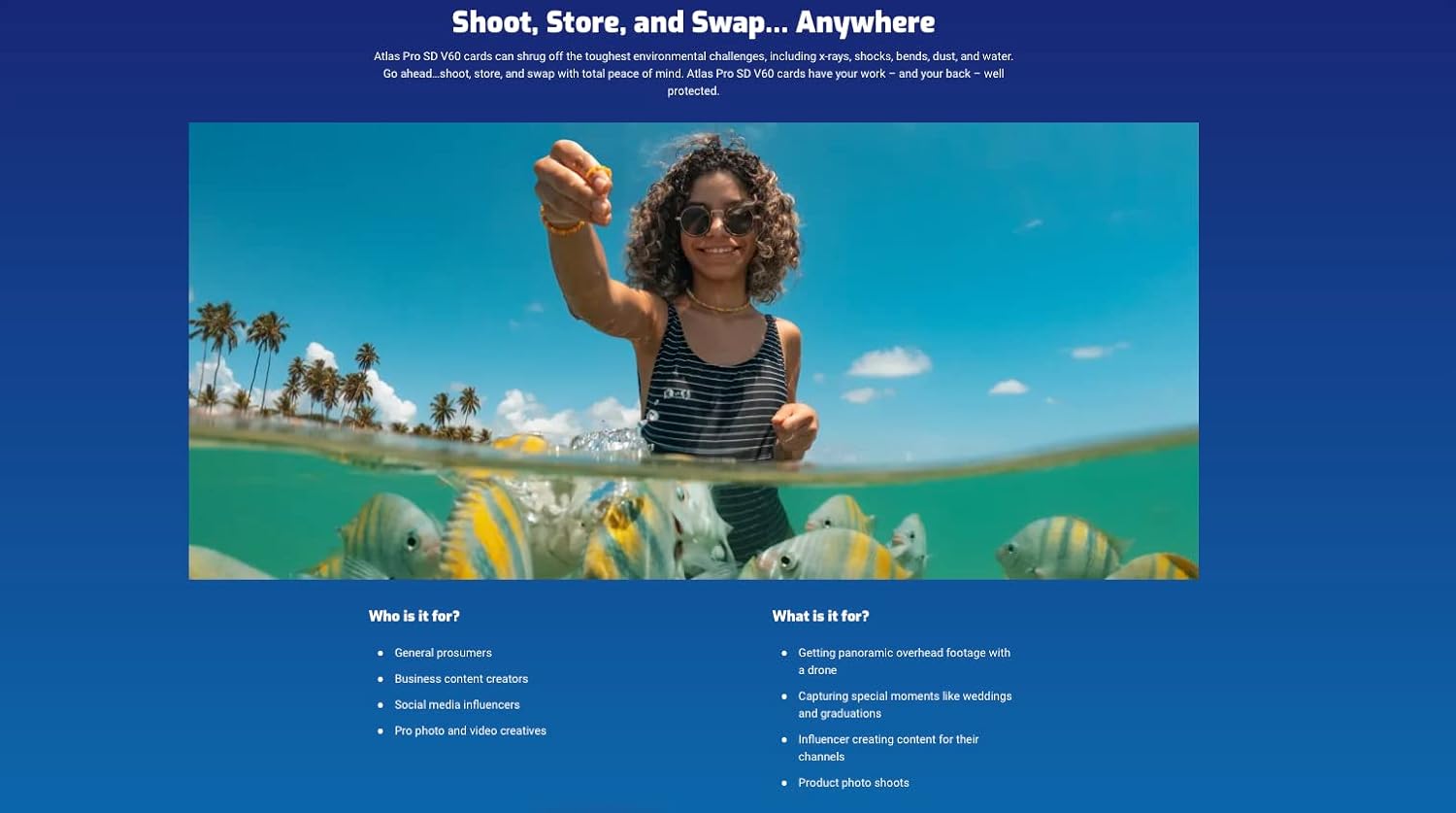 Atlas Pro SD V60 cards can shrug off the toughest environmental challenges, including x-rays, shocks, bends, dust, and water. Go ahead…shoot, store, and swap with total peace of mind. Atlas Pro SD V60 cards have your work – and your back – well protected.