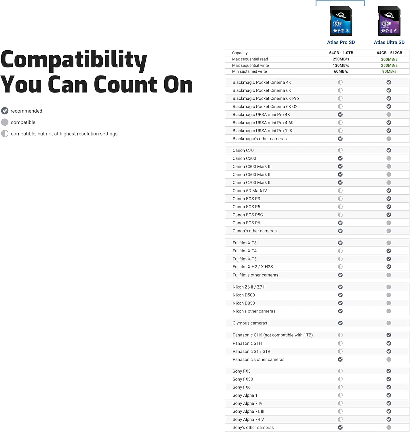 Thanks to an extremely thorough quality control process, you can work fearlessly knowing that your Atlas Pro SD V60 card will flawlessly deliver the speed and data integrity your irreplaceable content requires. With pro in its name, you can rest assured the Atlas Pro SD V60 isn’t some low priced, entry-level V30 card. Quality in, quality output. That’s the Atlas Pro SD V60 difference.