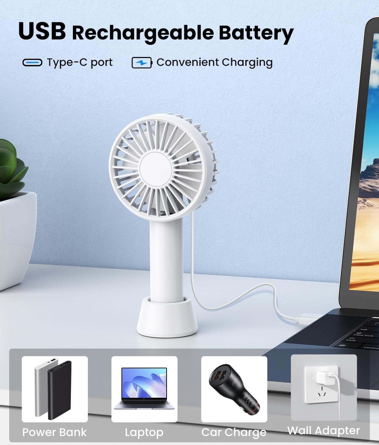 ✔️【4000mAh Rechargeable Hand Fan】- Comes with a 4000mAh battery, long working time under different wind speeds after fully charged. The handheld fan can be charged with any 5V USB charger, such as a PC, power bank, mobile phone adapter, computer, car charger, etc. You can enjoy a cool summer all day.
