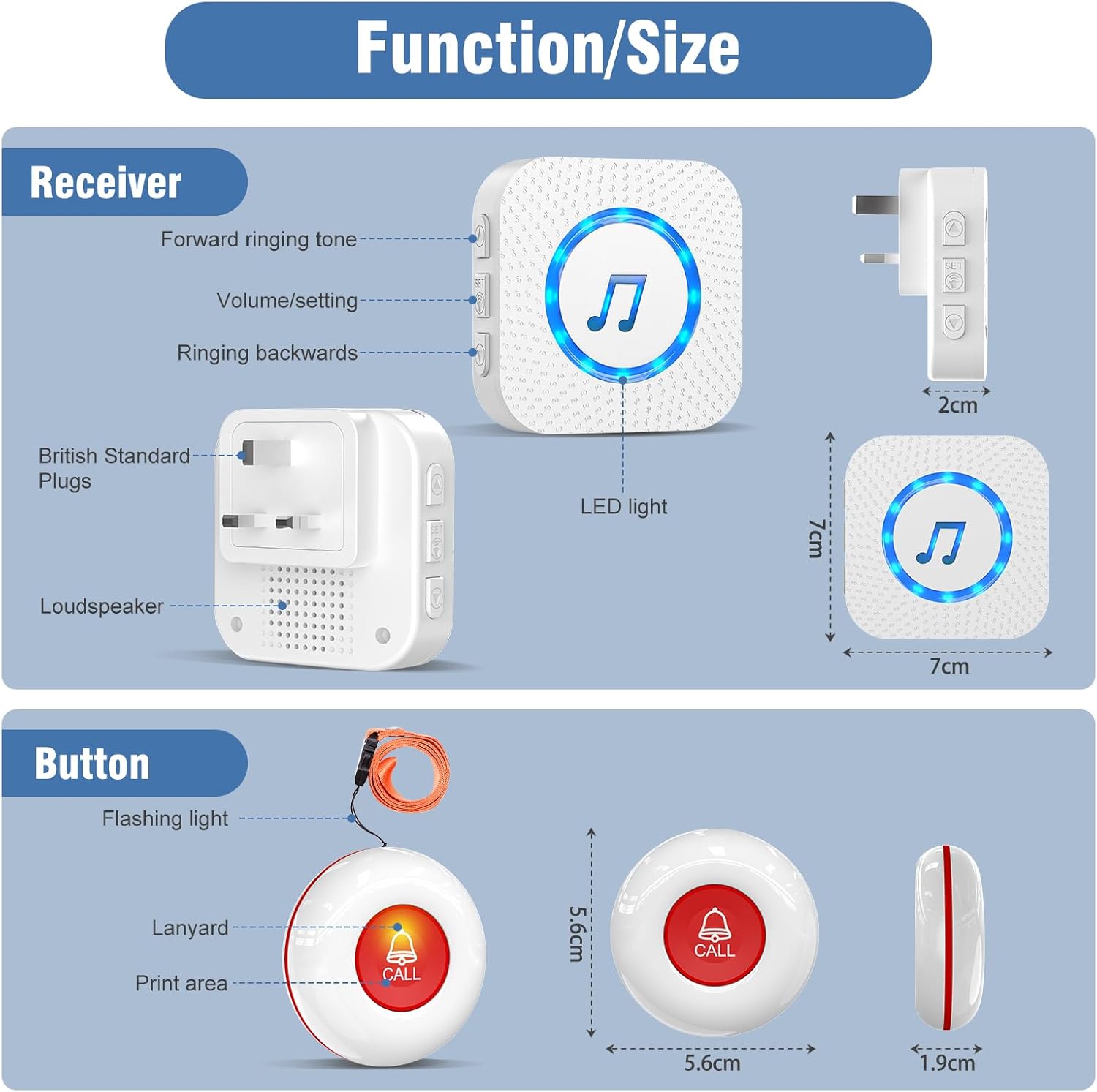 EASY SET UP: Easy use by plug the receiver into an electrical outlet, Even with limited function in the hands, a person will be able to press the call bell button to ask for help. The call button unit is splash proof and can be affixed on the bathroom wall. The receiver can be paired up to 50 help buttons/the sos button aslo can be paired up to 20 receivers. Can be used anywhere you need.