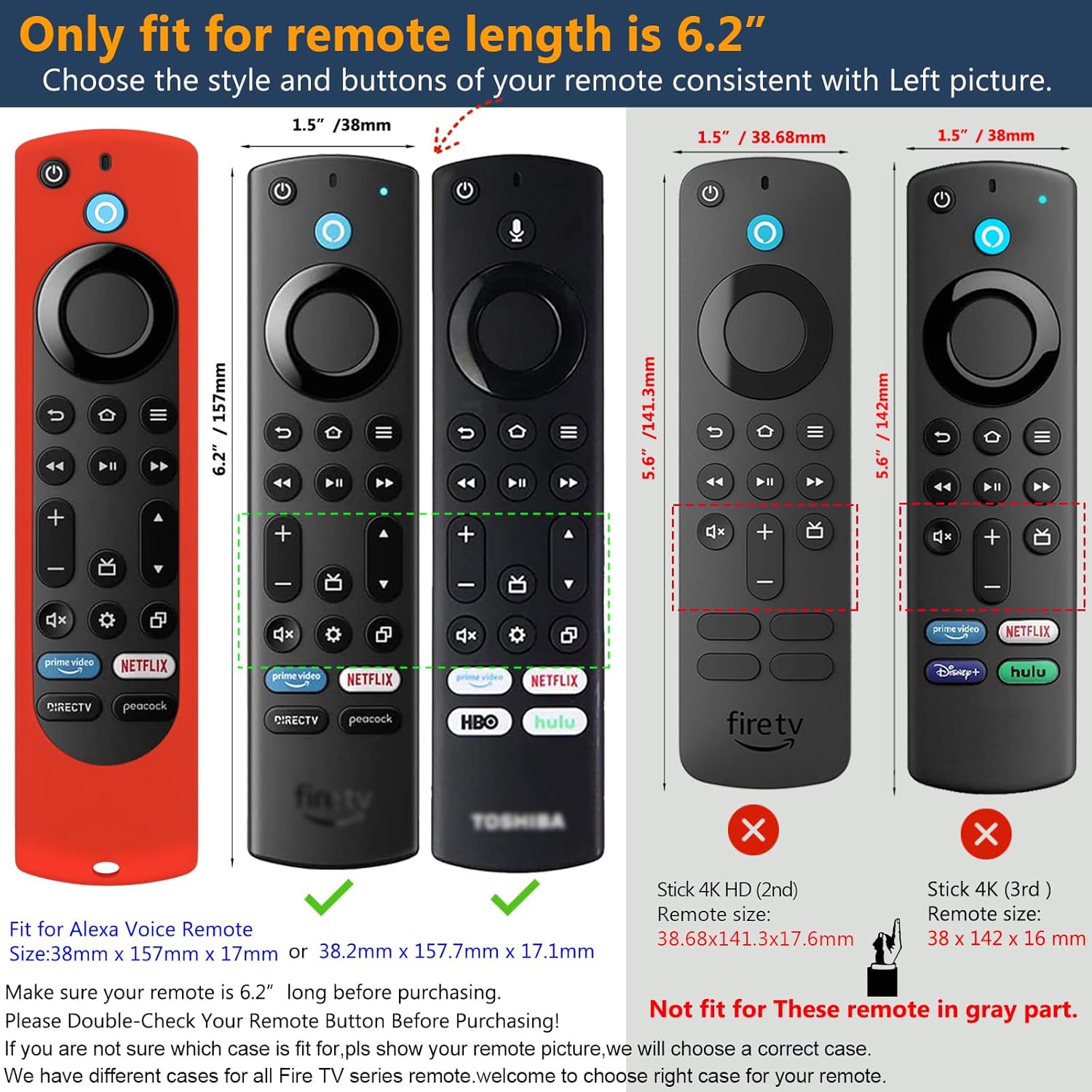 Compatible with Fire TV Stick 4K Max / 4K Max 2nd Alexa Voice Remote Enhanced (38x157x17mm).NOT Fit for Fire TV Stick 4K Alexa Voice Remote 3rd Gen 2021 Released (38x142x16mm)NOT Fit for Fire TV Stick 4K 2nd Newest Remote (38.68×141.3×17.6mm)