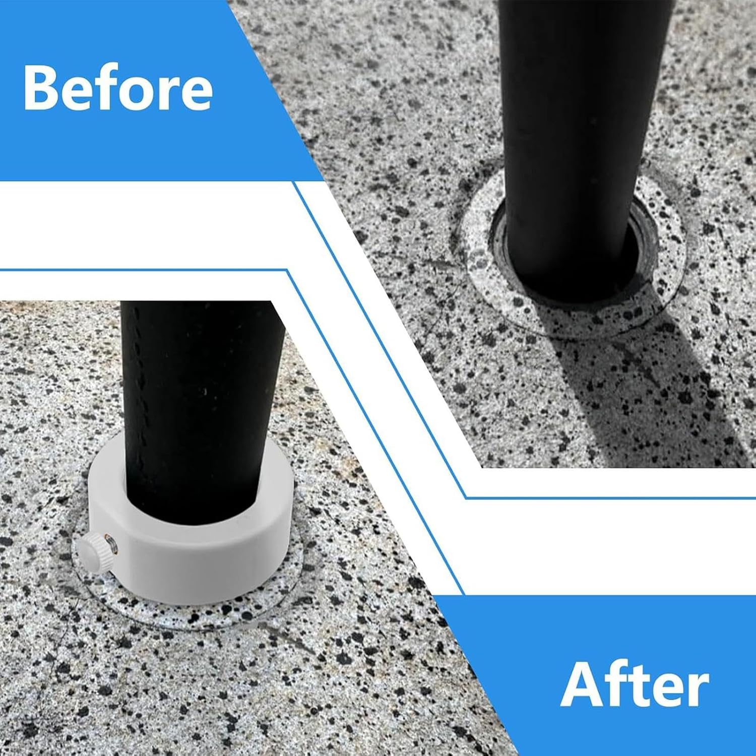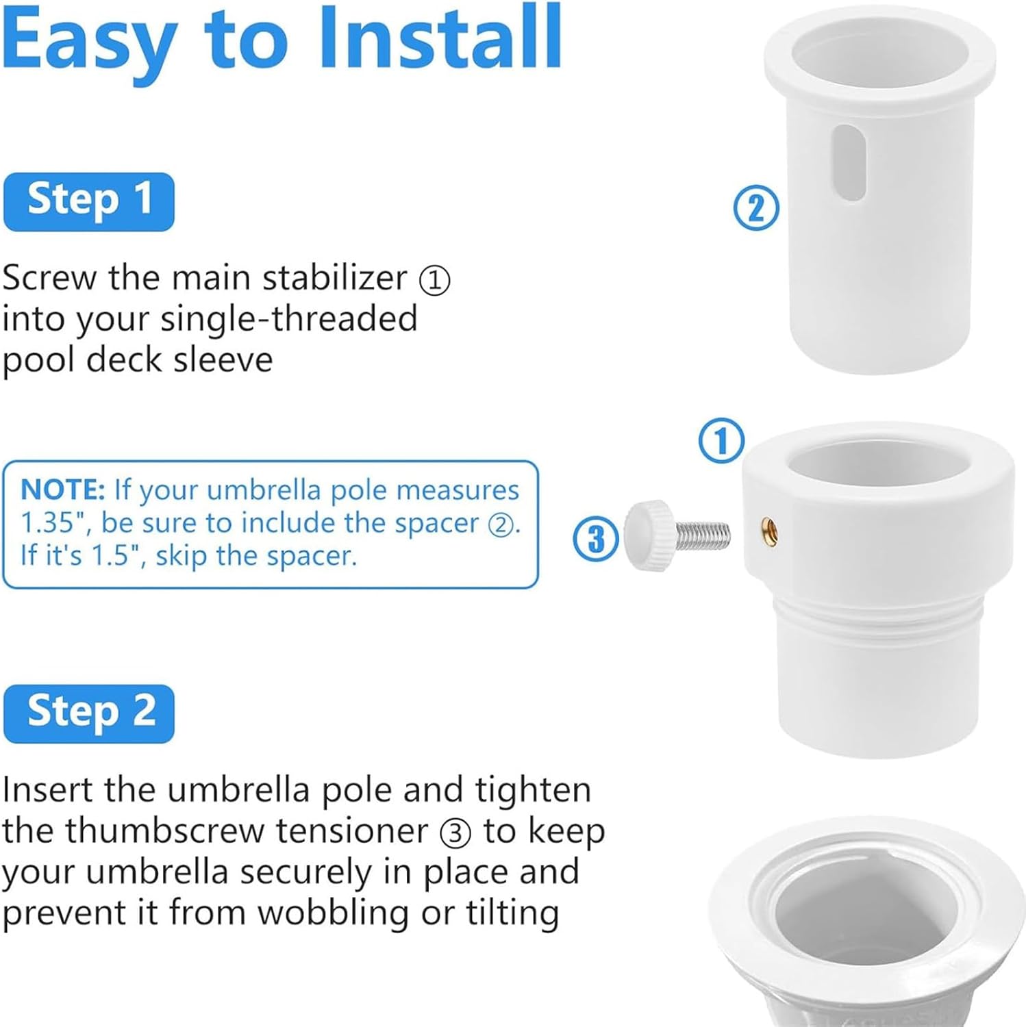 Designed to stabilize sunshade poles with dimensions of 1.5-1.35 inches, this umbrella pole stabilizer includes a reliable mount and adapter system. Its weather-resistant and windproof design makes it ideal for poolside shade, patio table covers, and deck lounging setups.