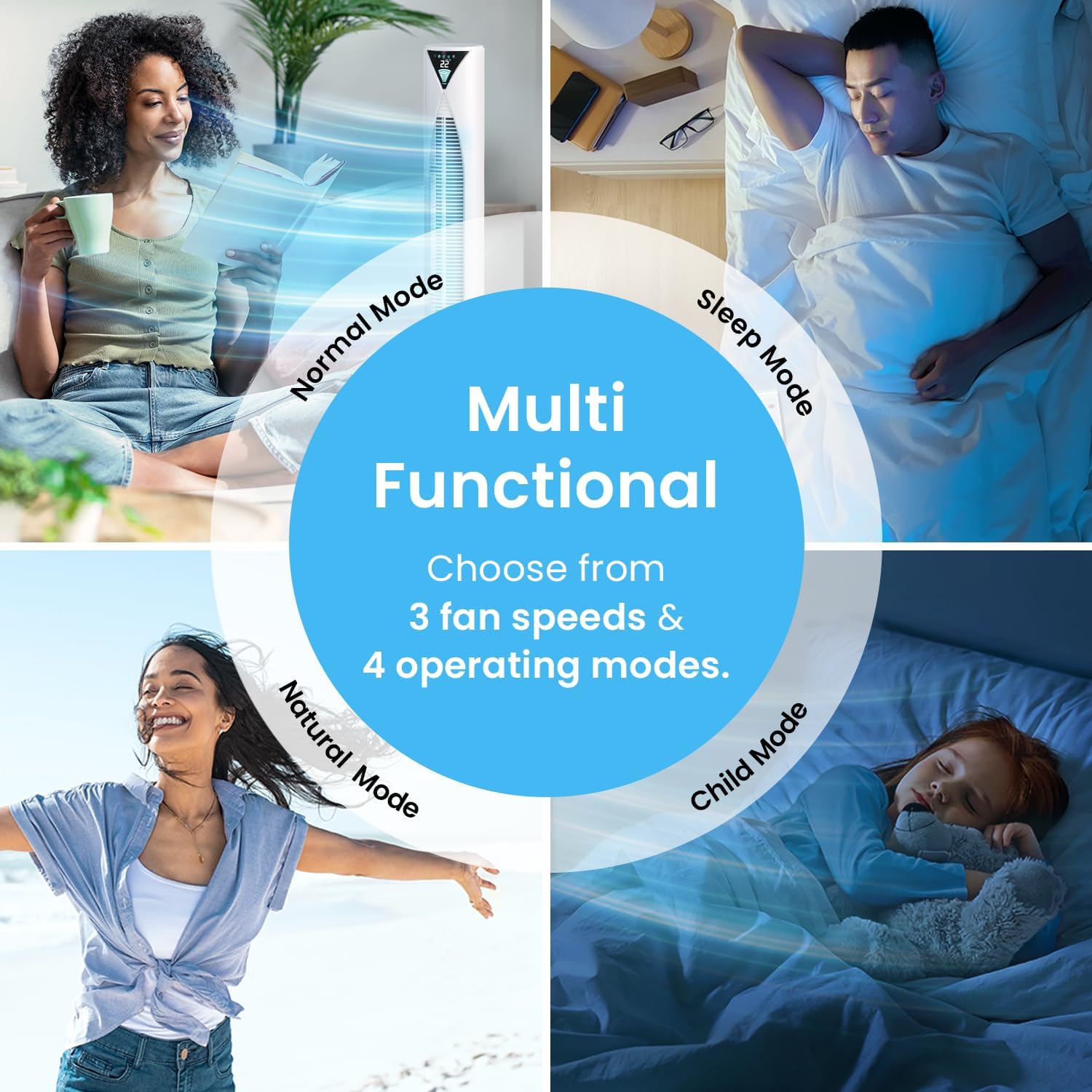 ENERGY SAVING WITH 4 MODES: Equipped with 3 efficient fan speeds, including low, medium and high power and 4 operating modes, including Child, Natural, Fan and energy saving Sleep Mode that keeps you cool and comfortable whilst reducing energy consumption overnight.
