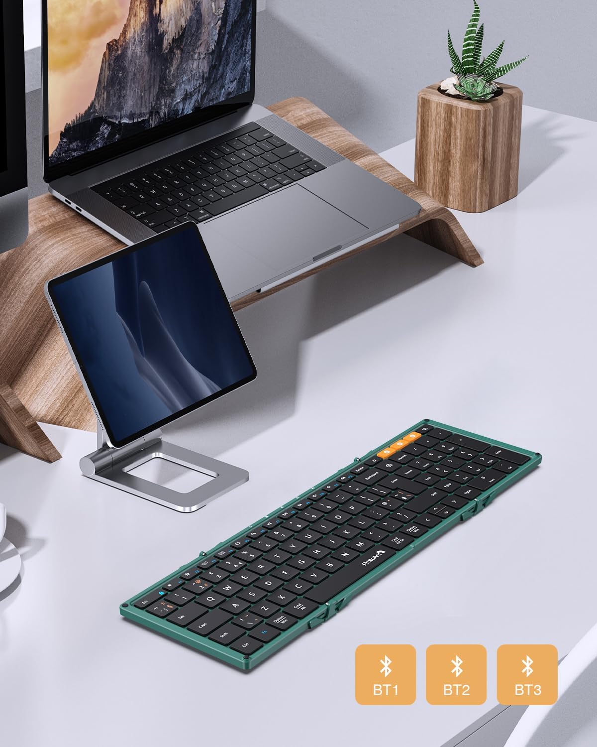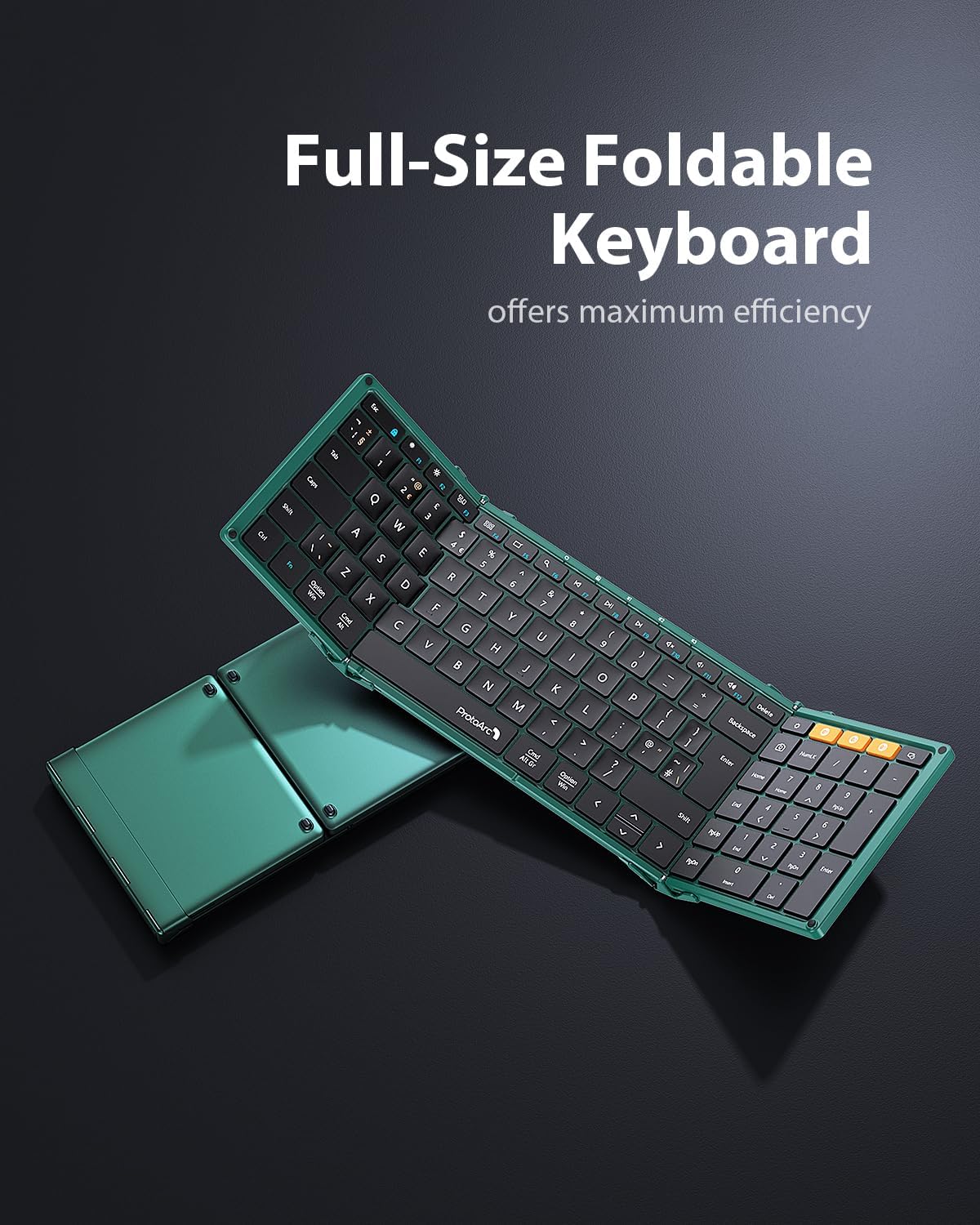 Full Size Foldable Keyboard: ProtoArc XK01 foldable bluetooth keyboard, the only full size wireless keyboard with folding design, is equipped with 105-key UK layout with number keypad. You can adapt to its familiar layout and are able to jump straight in without having to spend time getting used to the quirks found on smaller keyboards