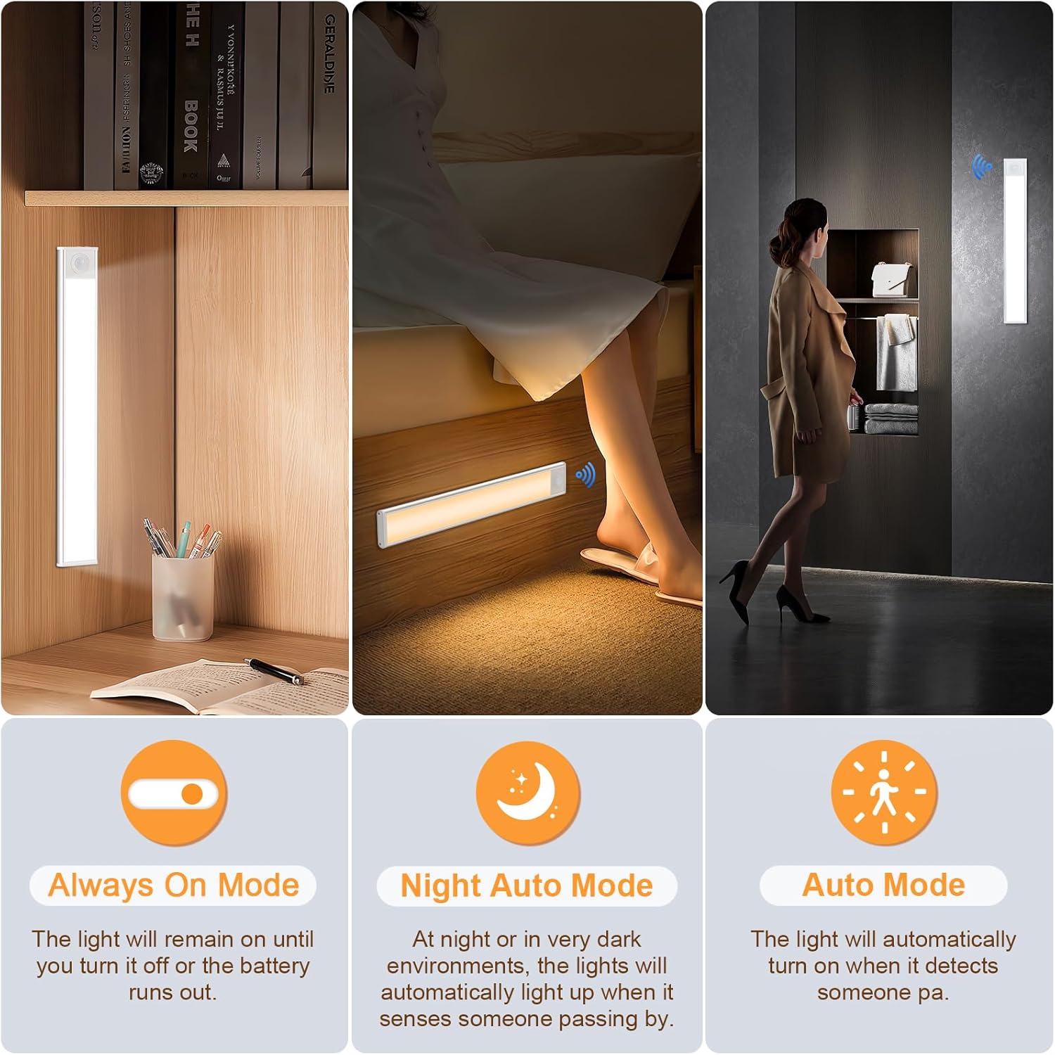 I bought these 30CM Under Cabinet Kitchen Lights to light up my wardrobe, and they are absolutely brilliant! The magnetic feature is fantastic, allowing them to be easily removed or adjusted as needed. I also love that they are rechargeable, which makes them super convenient and cost-effective.These lights are very bright, providing excellent illumination inside my wardrobe. The motion sensor feature is a game-changer â as soon as I open the wardrobe doors, they automatically turn on and then turn off about 10 seconds after closing the doors. Itâs so practical!The only downside is that the modes are a little bit confusing at first, but itâs not a huge issue since I mostly use one mode anyway. Overall, they are very well priced, highly functional, and a great addition to my wardrobe. I would definitely recommend them to anyone looking for a simple and effective lighting solution!