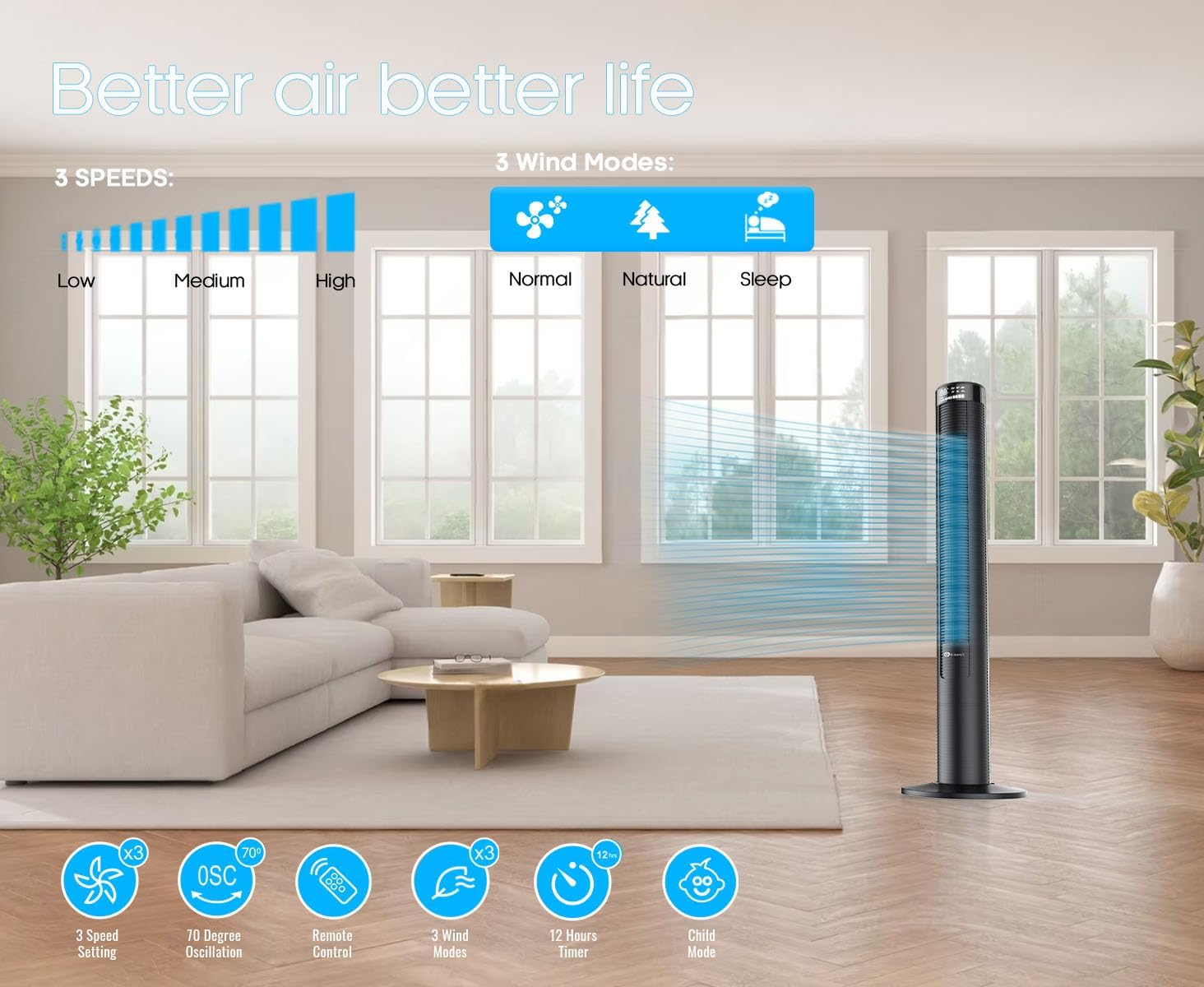 TIMER FUNCTION: The timer function helps you to set up a time after which the fan will turn off automatically. This durable tower fan’s timer operation allows control up to 12 hrs of continuous cooling time which can be adjusted in increments of 1 hrs.