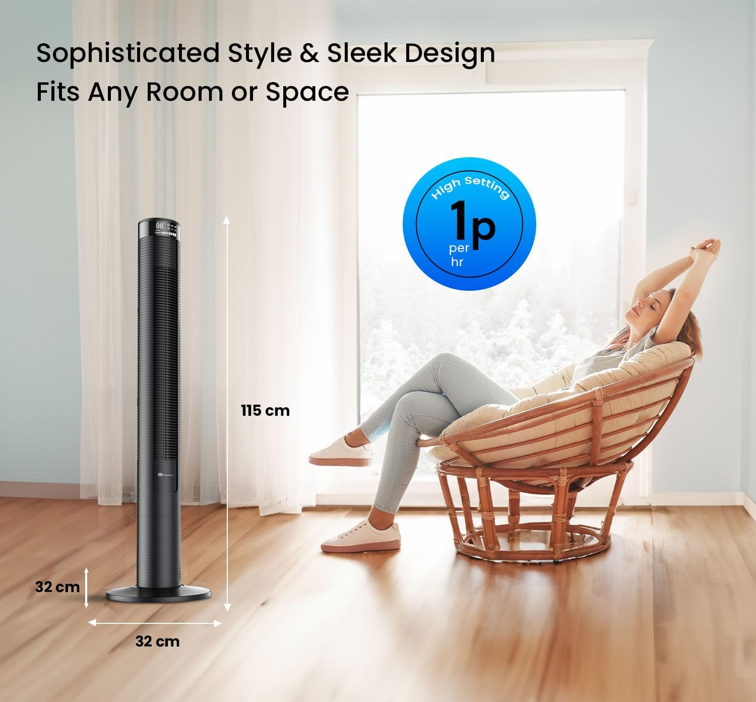 SAFE & EASY TO USE: The Puremate 46 inch tower fan has easy- to- see digital display. The easy to use control panel of the tower fan can either be operated manually or with the user friendly remote control that is provided (Batteries included) The generous 1.5m power cable allows for convenience when positioning the tower fan. The fan boasts of a premium 45W motor and is RoHS and CE certified.