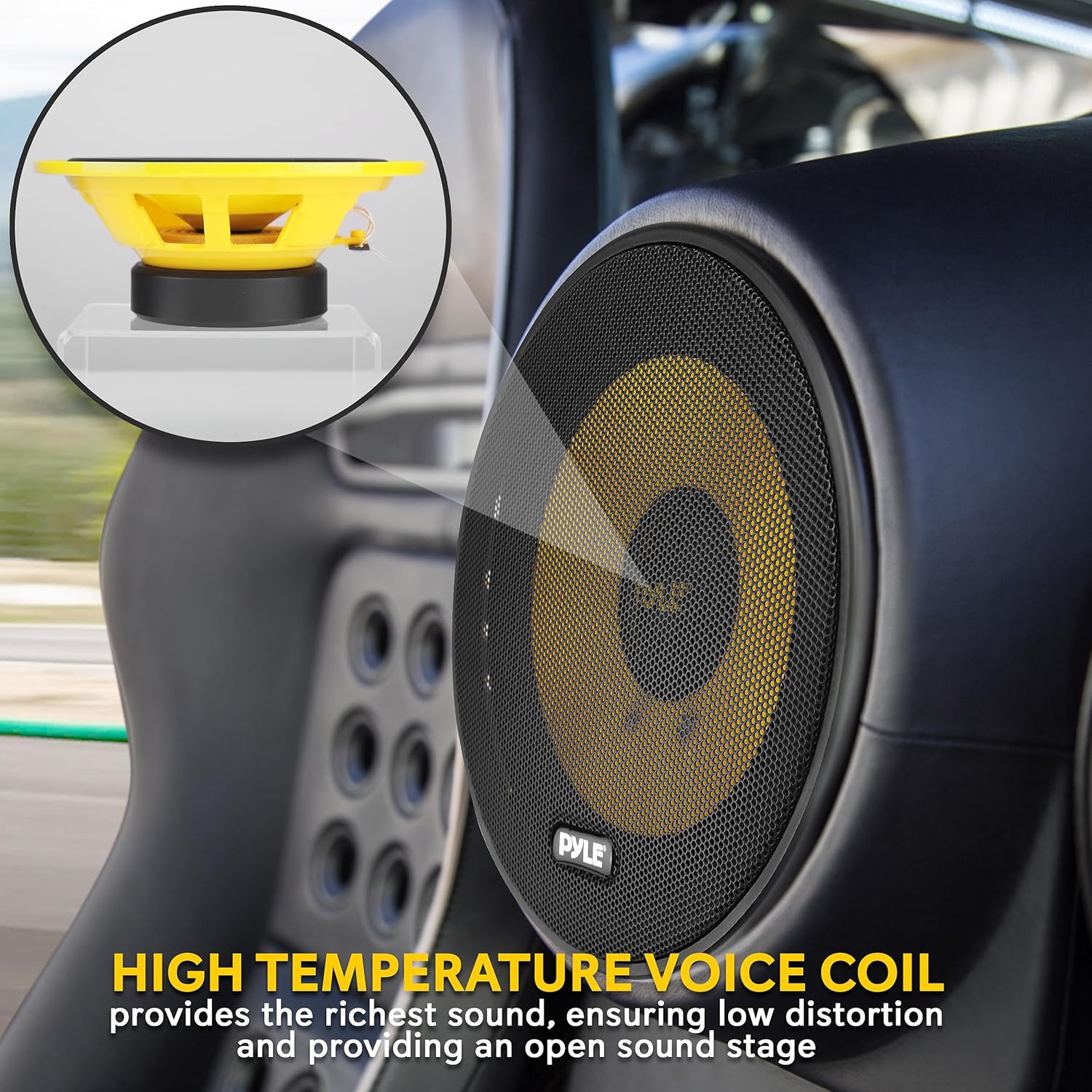 6.5” MID-BASS SPEAKERS: The 6.5-inch woofer features an eye-catching yellow color poly injection cone. Non-fatiguing butyl rubber surround keeps your speakers secure and ensures that the product will last for a long period of time
