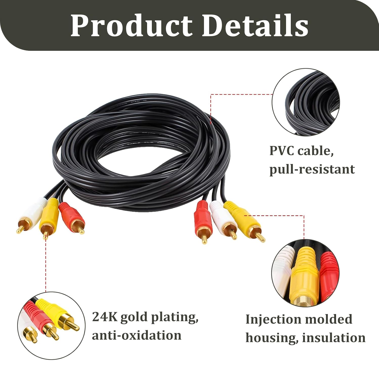 Practical Length: The 5-meter length allows for convenient placement of devices. Whether your audio and video devices are close together or spaced apart, this 3 RCA/Phono male plug to 3 RCA provides sufficient reach.