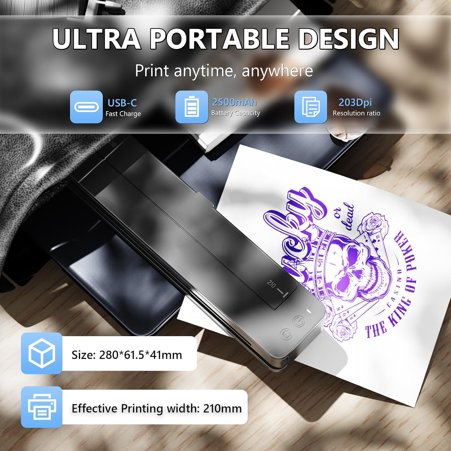 This tattoo stencil printer has been an awesome addition to my workspace. It came nicely packaged, and its lightweight, portable design makes it super easy to move around or use in different spots. Setting it up was a breeze, and the quick start guide included made it even simpler to dive right in.Connecting it is a snap, whether you use Bluetooth or the USB cable that comes with it, and it works great with various devices, including my phone and PC. The print quality is top-notch, giving me sharp and detailed stencils on the transfer paper provided. I really like the rechargeable battery, which lasts through a bunch of prints, making it ideal for taking on the go.Inside the box, youâll find everything you need to get started, like 10 sheets of tattoo stencil paper, a USB-C charging cable, and a converter plug. The thermal printing tech guarantees consistent results, and the printer runs smoothly as long as itâs charged up.