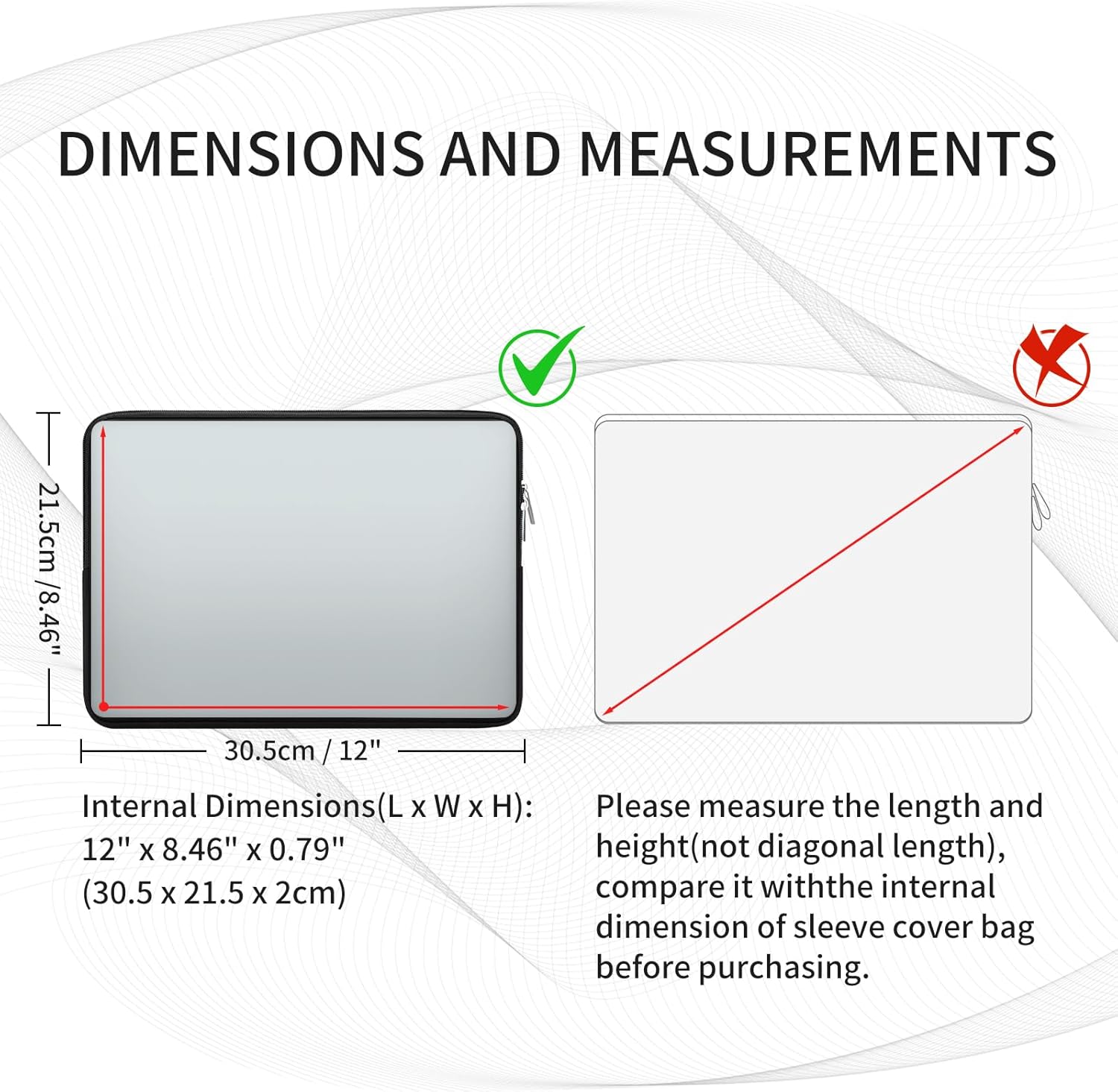 APPLICABLE SIZE & MODEL: Specially compatible with 11″-11.6″ MacBook/Laptop/Tablet/Notebook/Ultrabook, External Dimensions(L x W x H): 12.40″ x 9.05″ x 0.98″(31.5 x 23 x 2.5cm), Internal Dimensions(L x W x H): 12″ x 8.46″ x 0.79″(30.5 x 21.5 x 2cm). There may be measured error with the dimensions, considering the ductility of material