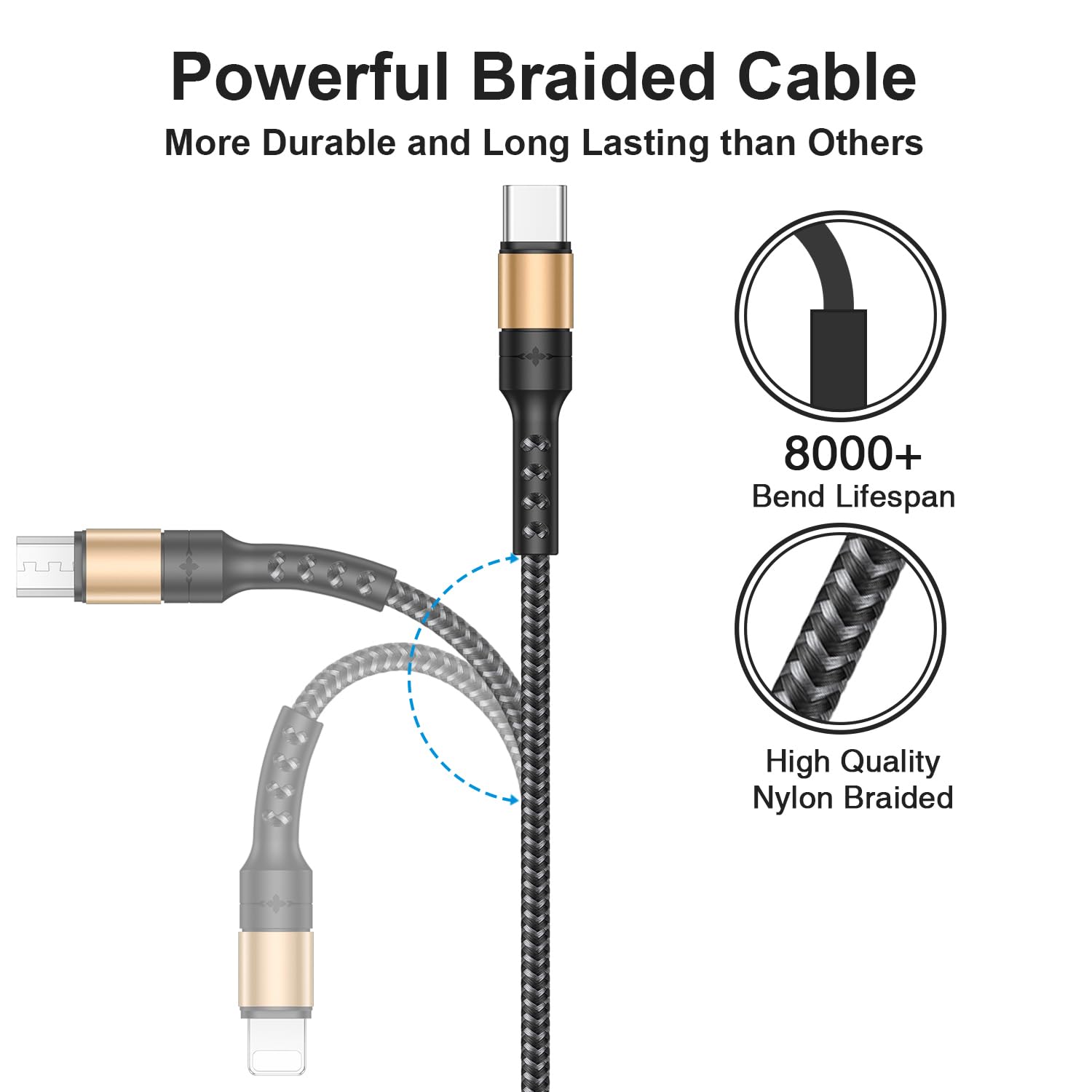 【Strengthen Durability-Design】Encased with Strong-Braided Nylon fiber, which make it have excellent anti-twisting and abrasion-proof property.This 3 in 1 multi charging cable can withstand at least 10000+ cycles of 90 degree bend test. Very suitable for your daily use.