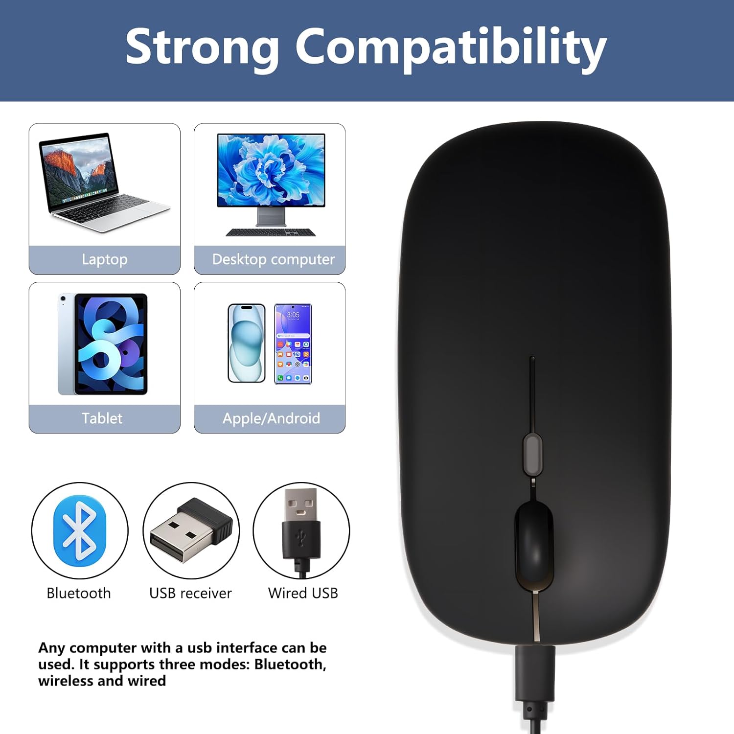 Universal Capacity: Rechargeable wireless mouse Compatible with more than 99% of Bluetooth devices. This Bluetooth device is highly adaptable and can connect to almost all Bluetooth products on the market, whether it is a for windows computer, for Android for phone or for macbook for apple notebook, mouse bluetooth all can be connected in seconds, even old devices can be stably connected, playing games, listening to music, for macbook mouse and transferring files are super smooth