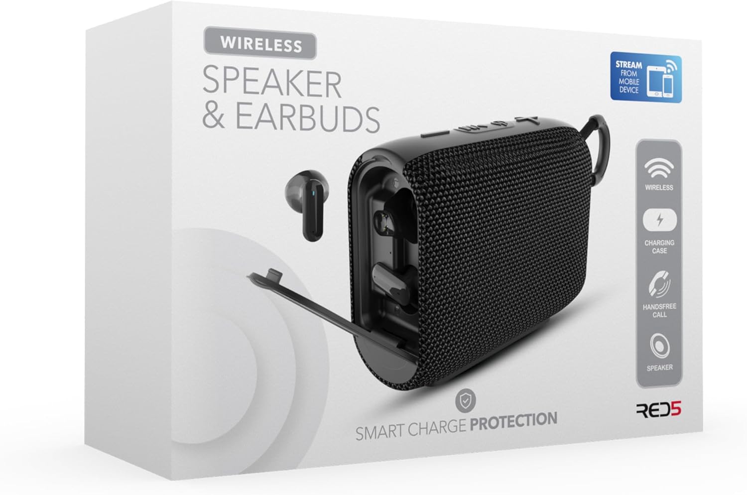 RED5 Black Wireless Bluetooth Earbuds and Rechargeable Speaker Charging Case Set