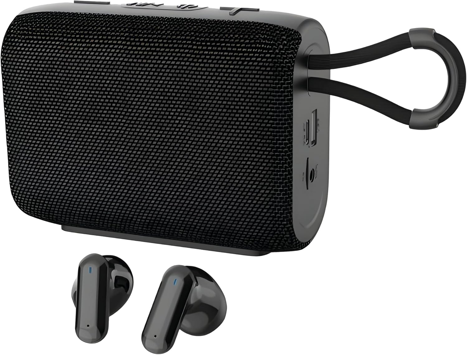 Speaker Bluetooth Version 5.1 Speaker Wireless Distance 10 metres Speaker Input voltage DC 5V Speaker Charging Time 3 Hours Speaker Playing Time 3 Hours Speaker Automatic Shutdown 10 Minutes Speaker Battery Capacity 1200 mAh Earbuds Bluetooth Version 5.3 Earbuds Operating Mode Touch Control Earbuds Charging Time 1.5 Hours Earbuds Playback Time 3 Hours Earbuds Sensitivity 106 dB SPL +- 3dB Earbuds Wireless Distance 10 metres Earbuds Battery Capacity 300 mAh