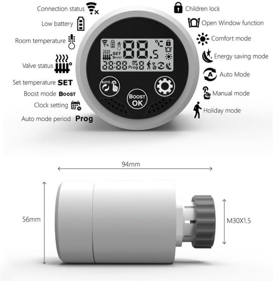 [Open Window Detection]When room temperature suddenly drop into temp. threshold,valve close for 15 minutes.After that,if the room temp. is still lower than temp. Threshold,it keep this mode.Besides,it’s easy to read digital display with Celsius temperature.