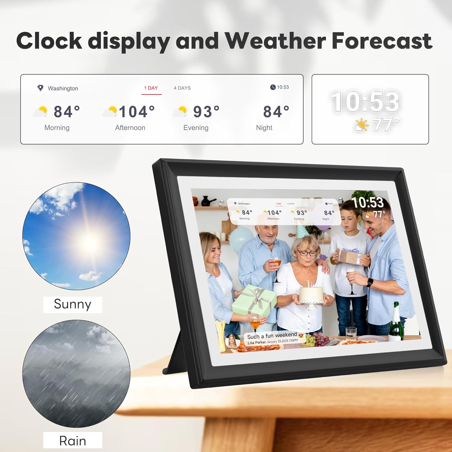 [Versatile Functionality]Digital photo frame goes beyond just displaying images. It supports video,music,calendar,clock,weather forecast and provides an auto on/off function. Experience the convenience of adjusting playback order,zooming in on pictures,hiding/publishing pictures,displaying titles,and enjoying adjustable brightness and sleep mode. With its energy-saving day-night mode,the frame can automatically power on and off,providing added convenience and saving energy in your daily life.