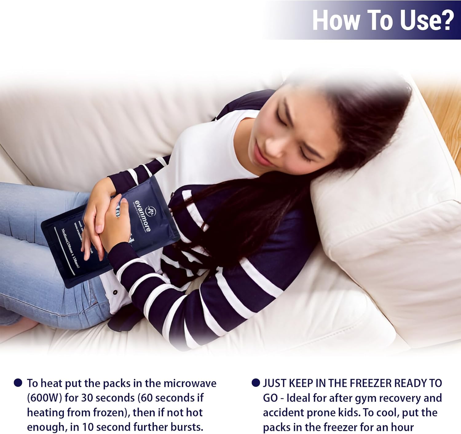 REALLY EASY TO USE – One pack for hot and cold. Heats up quickly in the microwave (or hot water) and holds heat for ages and freezes fast and stays really cold for ages too. Just keep one in the freezer ready to go. ideal for gym recovery and accident prone kids. Instructions are printed on the packs so you don’t need to hunt for instructions every time