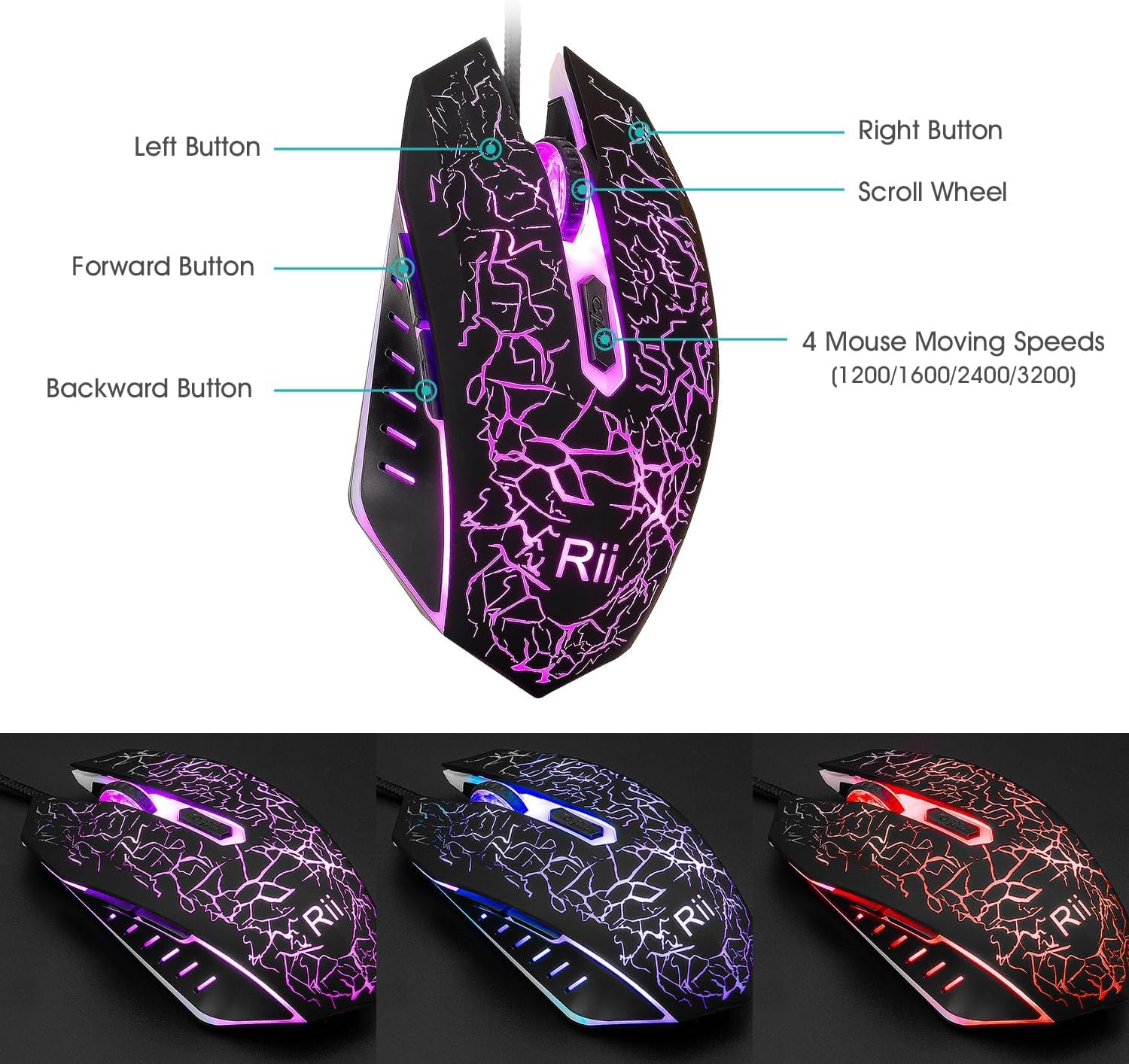 【High Performance Gaming Mouse】Rii Wired Gaming Mouse keys life 3 million click, 4 Mouse Moving Speeds(1200/1600/2400/3200),Laser carved characters, non-slip design. High-speed USB cable with high-strength braided fiber cable.