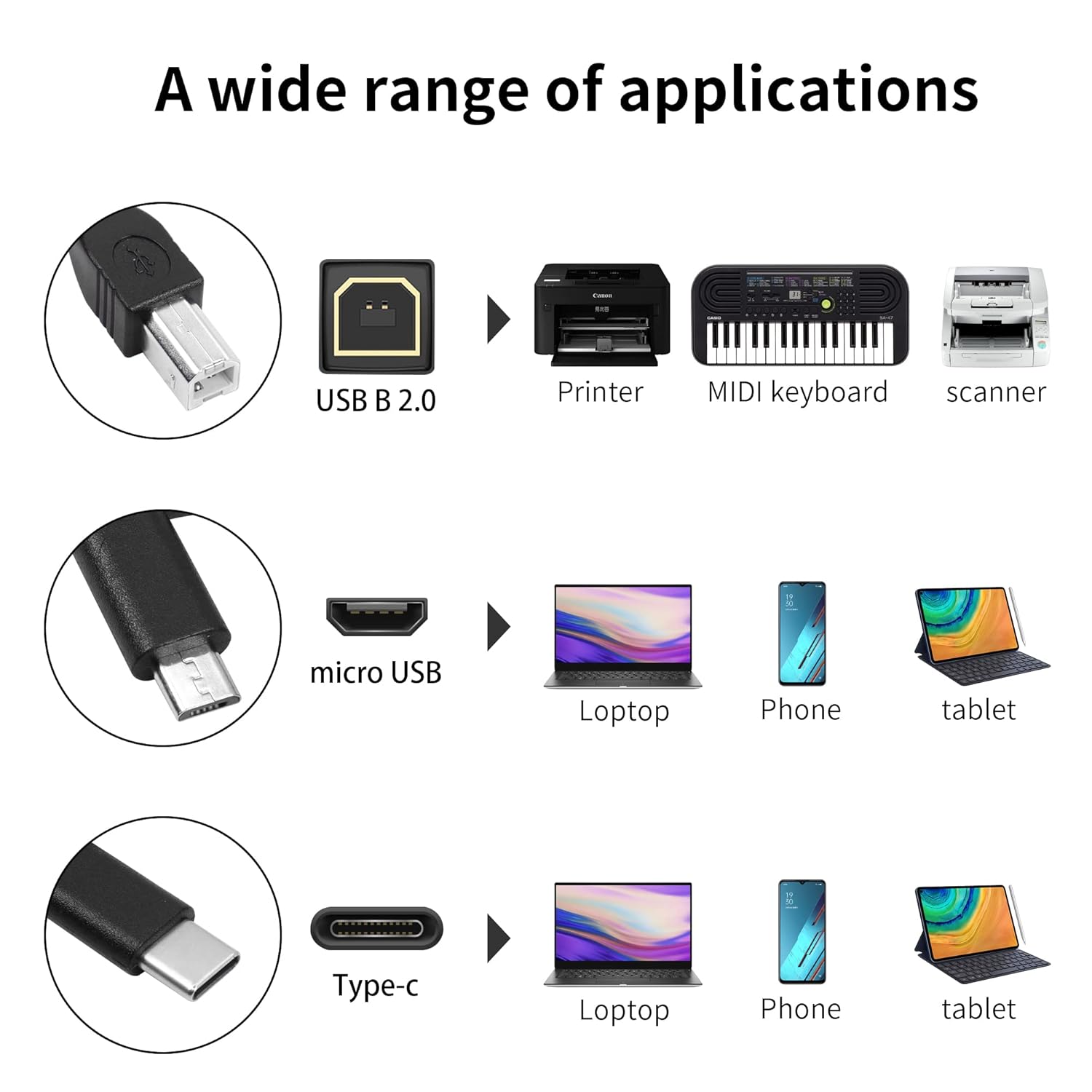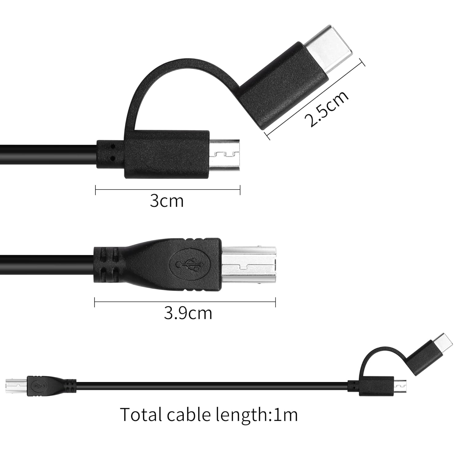 USB B to USB C and Micro USB printer cable not only supports connecting printers, scanners, fax machines as print cables, but also supports connecting most audio devices with UBS B ports keyboards, guitar speakers, DJ controls as MIDI cables.