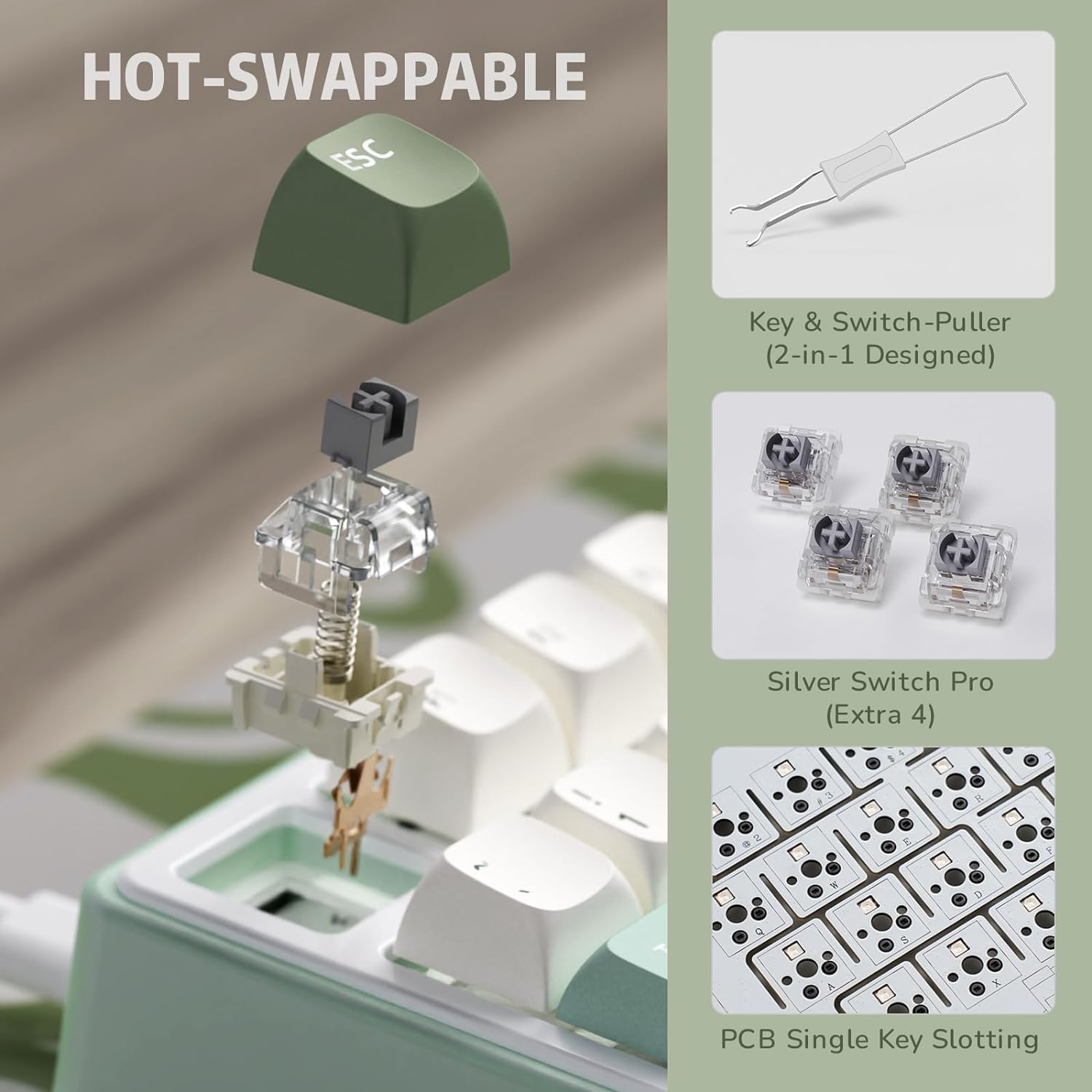 Hot-Swappable Speed Silver Switch Pro – R75 mechanical keyboard adopts high speed silver switch Pro with port surrounding to provide a stable input experience. This keyboard gaming’s switches with shorter travel make the keys respond quick, not only improve productivity, but also meet your needs for responsiveness in games. The hot swappable PCB of this gasket mounted keyboard is compatible with 3Pin or 5Pin Switches.
